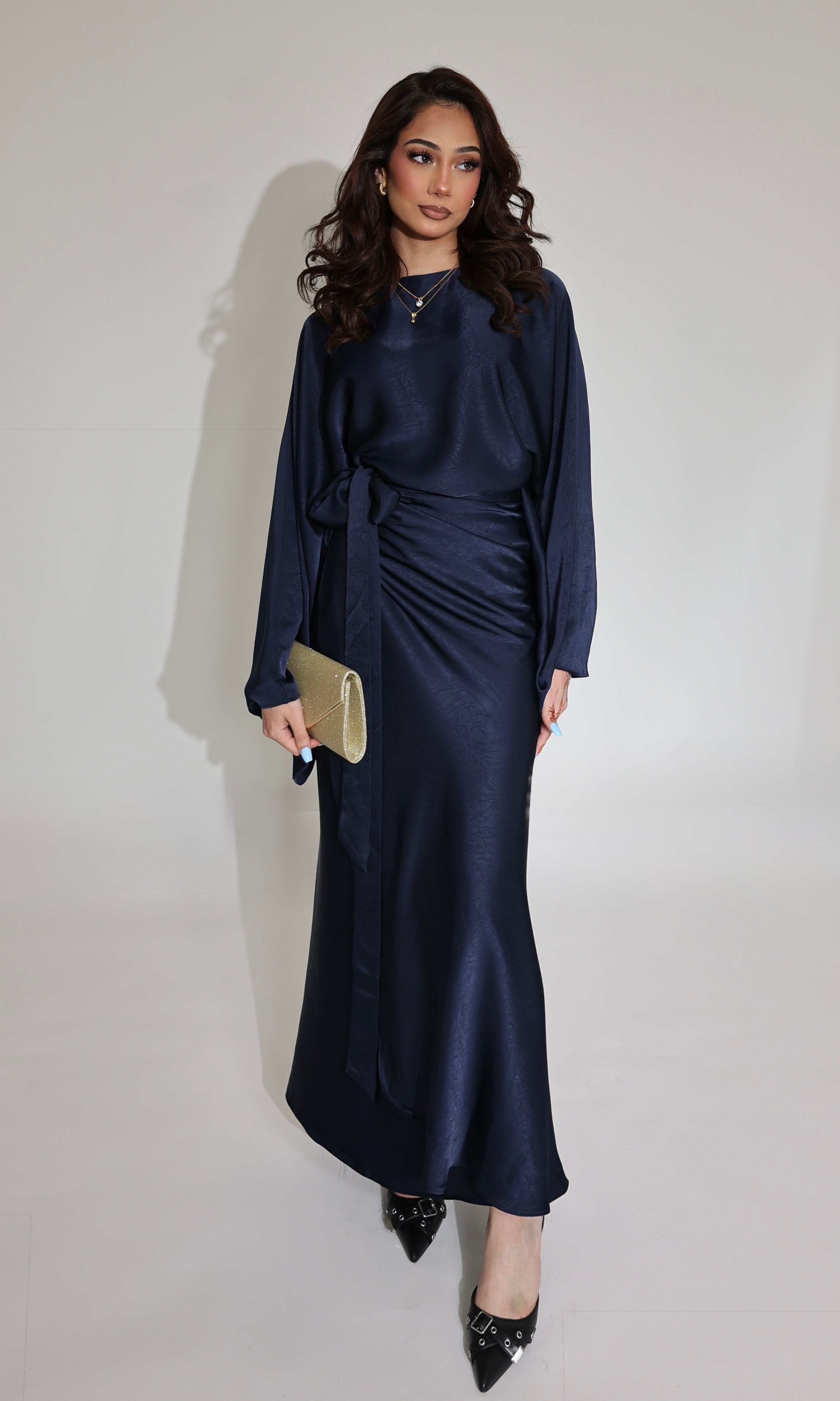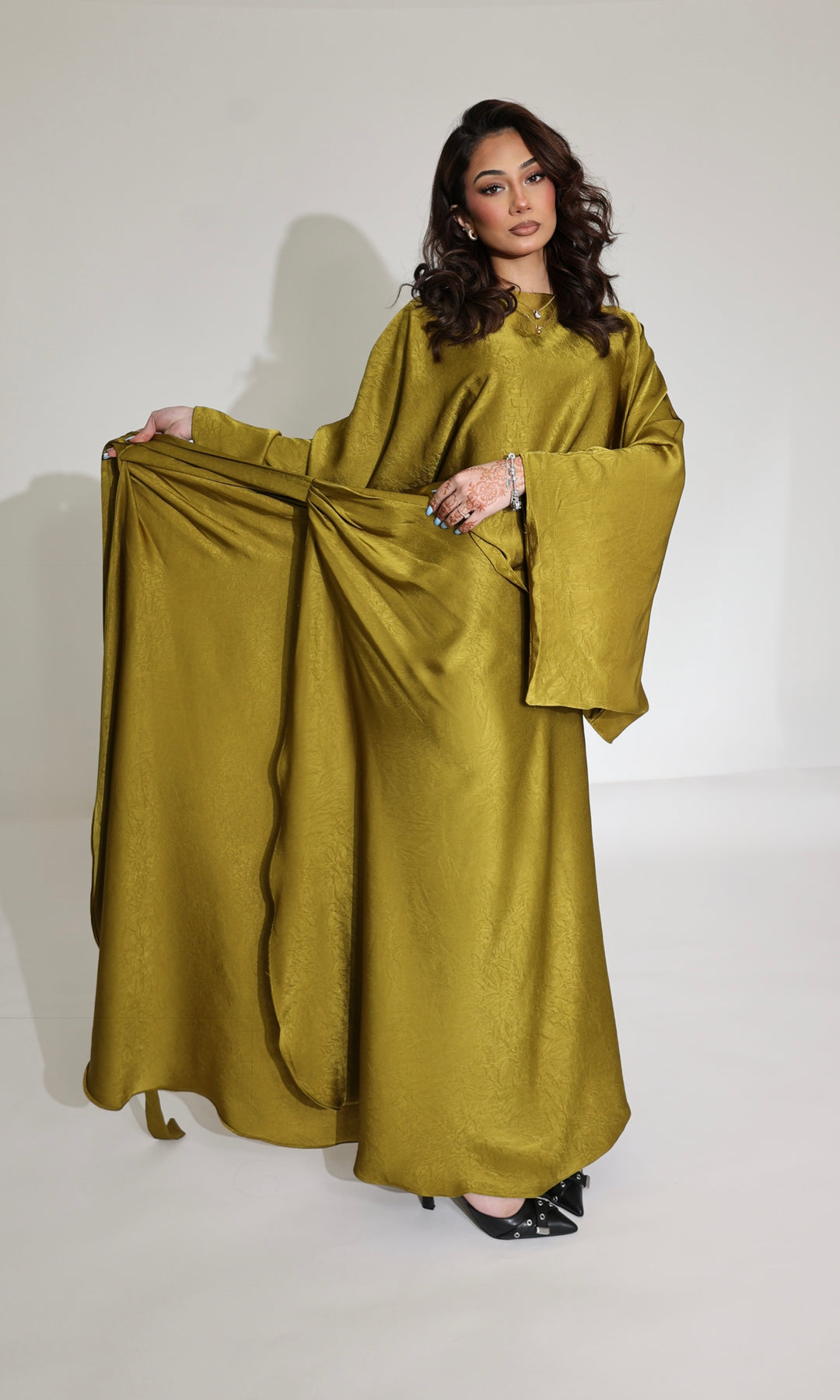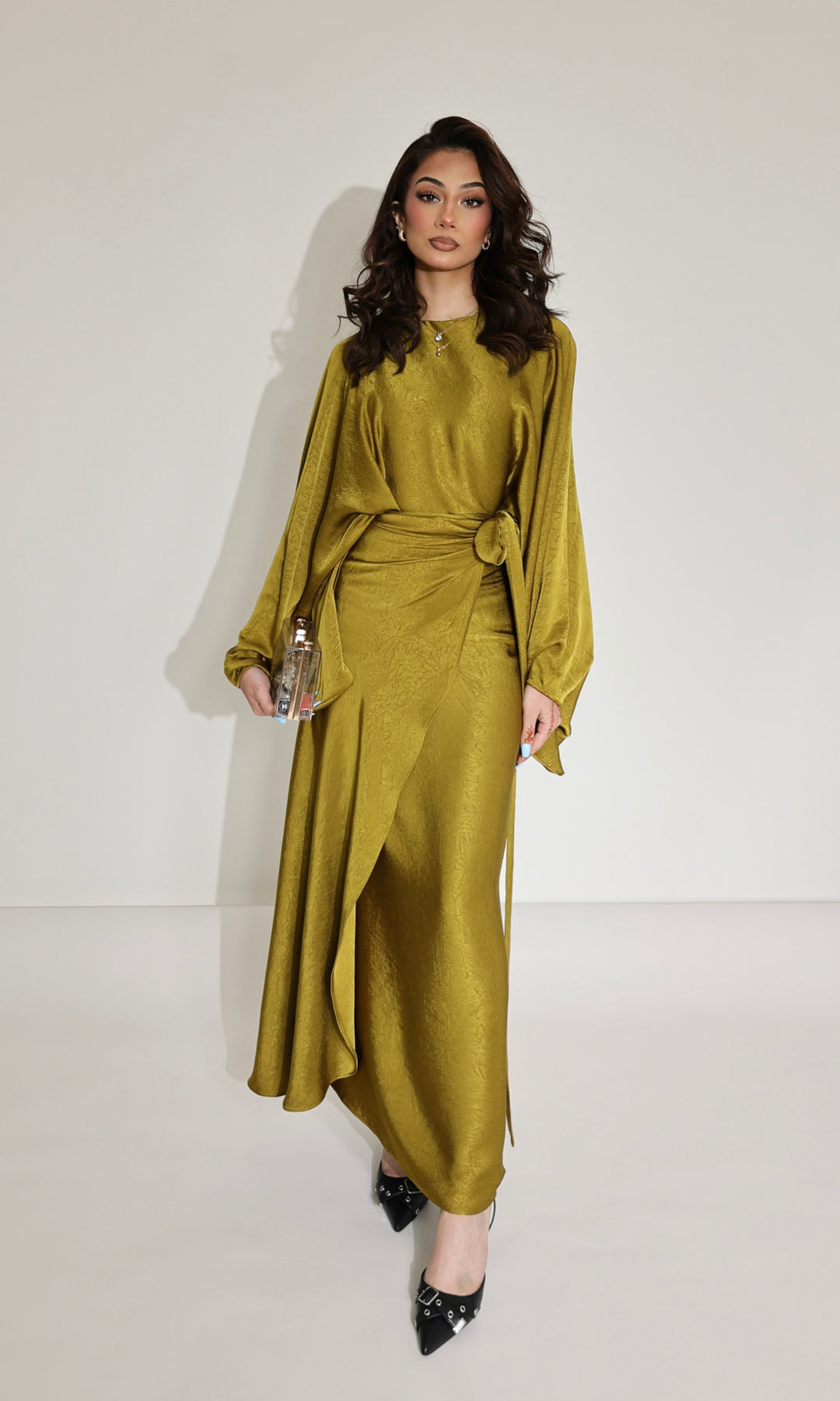 Elevate your wardrobe with our Luna Luxe Kaftan Dress, a stunning fusion of elegance and ease. Crafted from a premium jacquard satin fabric with a subtle sheen and intricate texture, this dress flows beautifully with every step. The relaxed silhouette is enhanced with draped batwing sleeves and a built-in wraparound belt that cinches at the waist for a flattering shape.