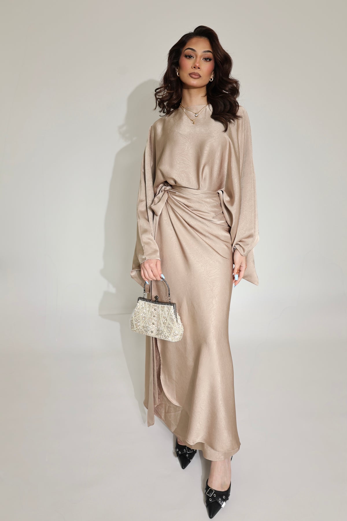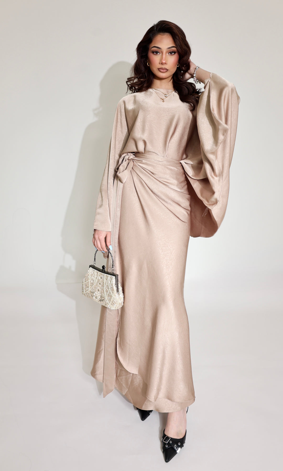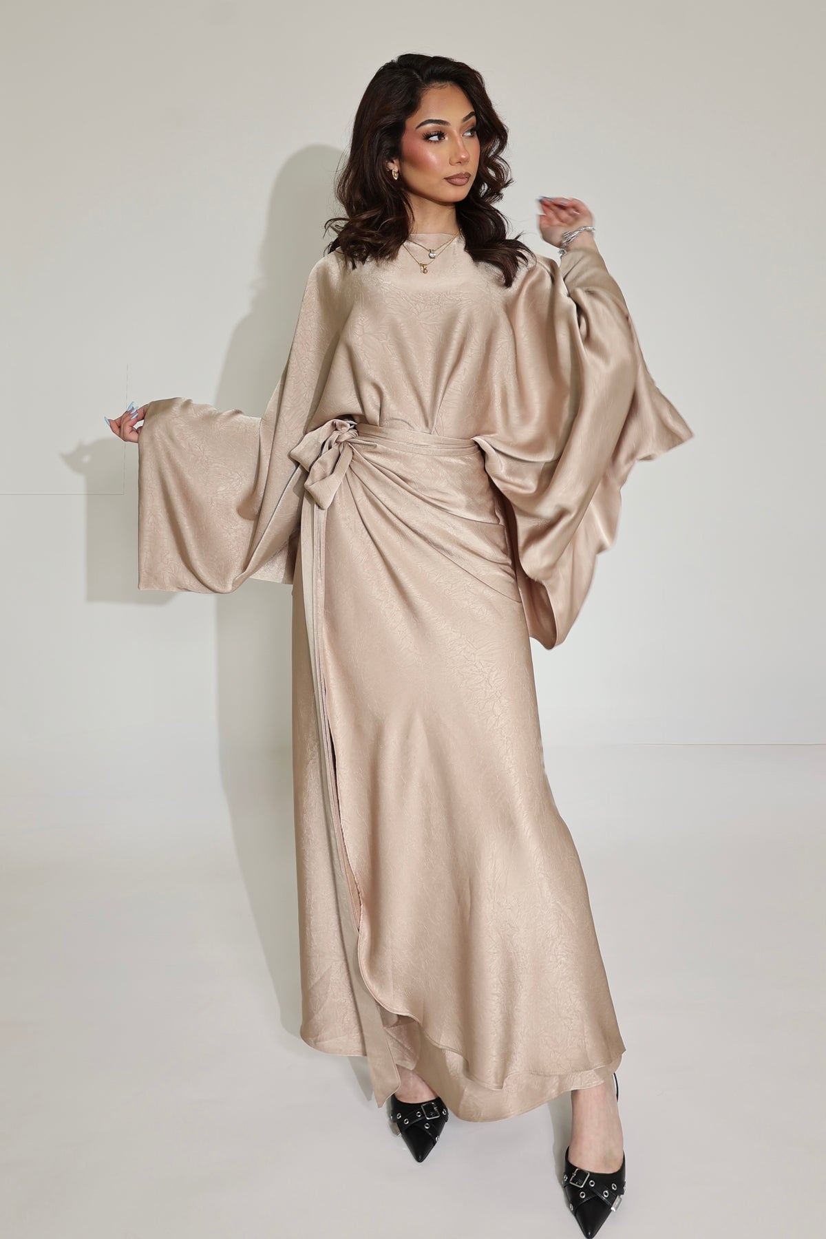 Elevate your wardrobe with our Luna Luxe Kaftan Dress, a stunning fusion of elegance and ease. Crafted from a premium jacquard satin fabric with a subtle sheen and intricate texture, this dress flows beautifully with every step. The relaxed silhouette is enhanced with draped batwing sleeves and a built-in wraparound belt that cinches at the waist for a flattering shape.