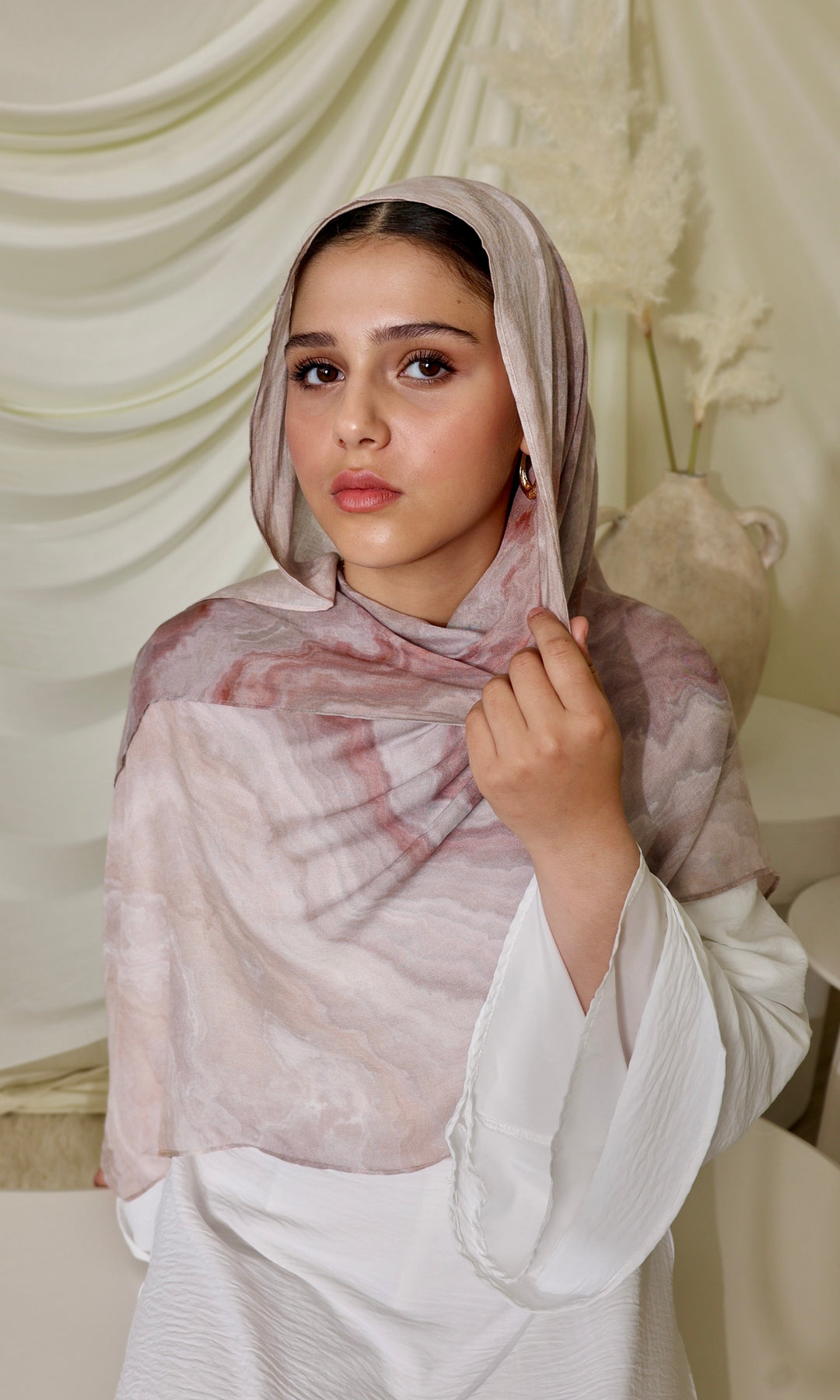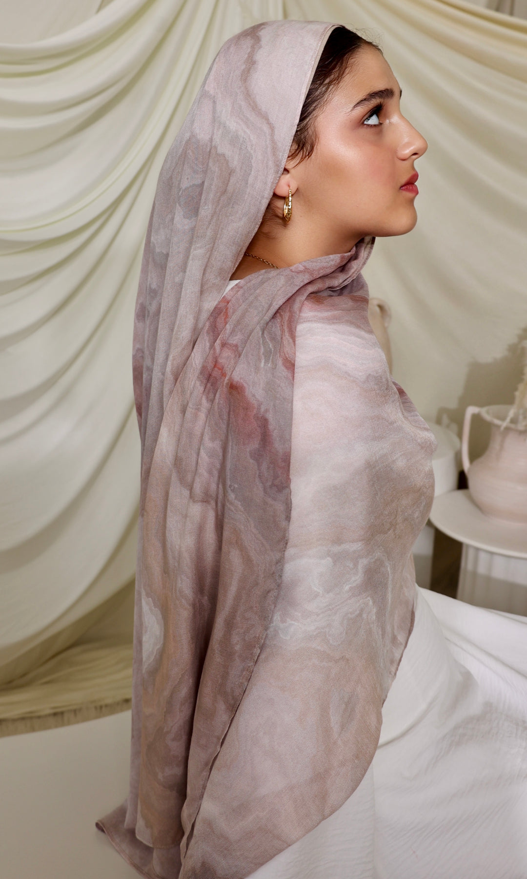 Elegant and earthy, Blush Stone draws inspiration from natural marble with flowing tones of muted rose, taupe, and cream. Crafted from ultra-light modal, it offers a gentle drape and feather-soft feel. A perfect neutral with subtle warmth — refined, grounded, and beautifully effortless.