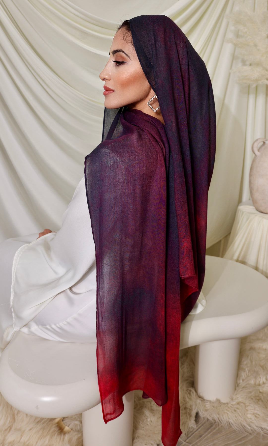 Bold meets beauty in Velvet Amber — a deep fusion of burgundy, burnt red, and midnight undertones, like molten velvet kissed by firelight. Crafted from airy, ultra-soft modal, it drapes effortlessly with a lightweight feel. This hijab is for the woman who wears warmth like power and elegance like armor.