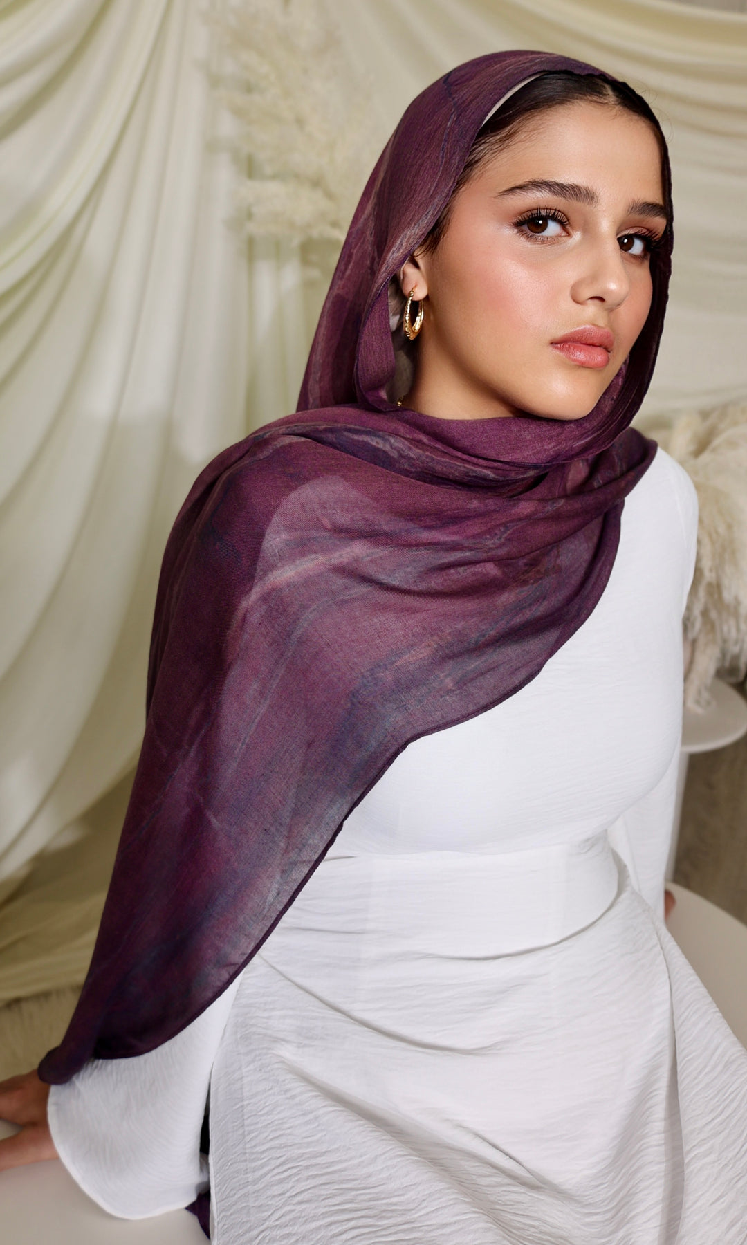 Earthy, moody, and effortlessly bold — Mulberry Vein captures the essence of nature’s raw beauty through flowing streaks of deep plum and mauve on a rich modal canvas. Lightweight and breathable, this hijab offers a fluid drape and soft touch, perfect for adding an elevated edge to any outfit.