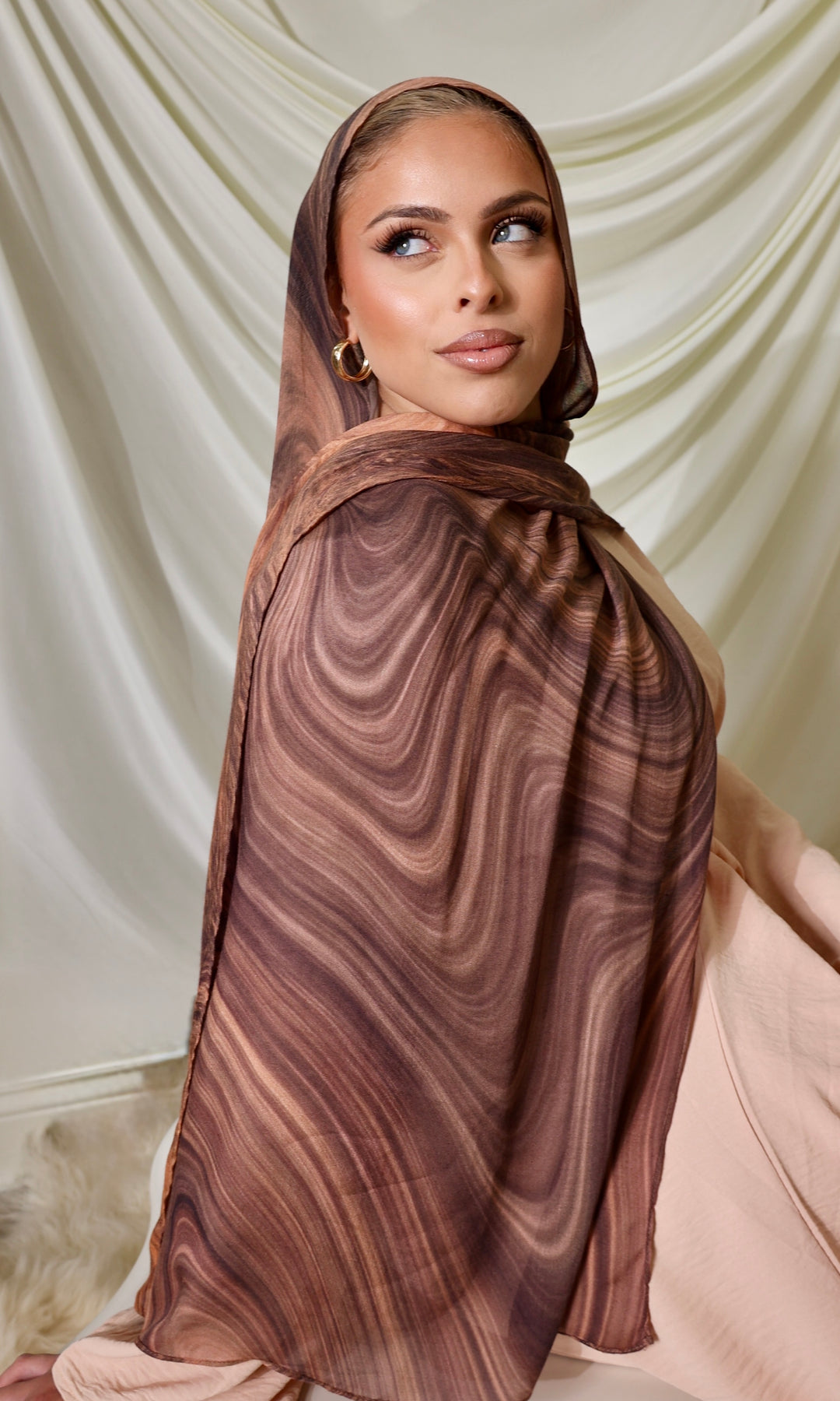 Rich, warm, and endlessly elegant — Cocoa Swirl is a luxurious modal hijab featuring hypnotic swirls of chocolate brown and caramel. The marble-like pattern evokes natural woodgrain with a soft, fluid drape and lightweight feel. Perfect for grounding your look with earthy tones while making a quiet, confident statement.
