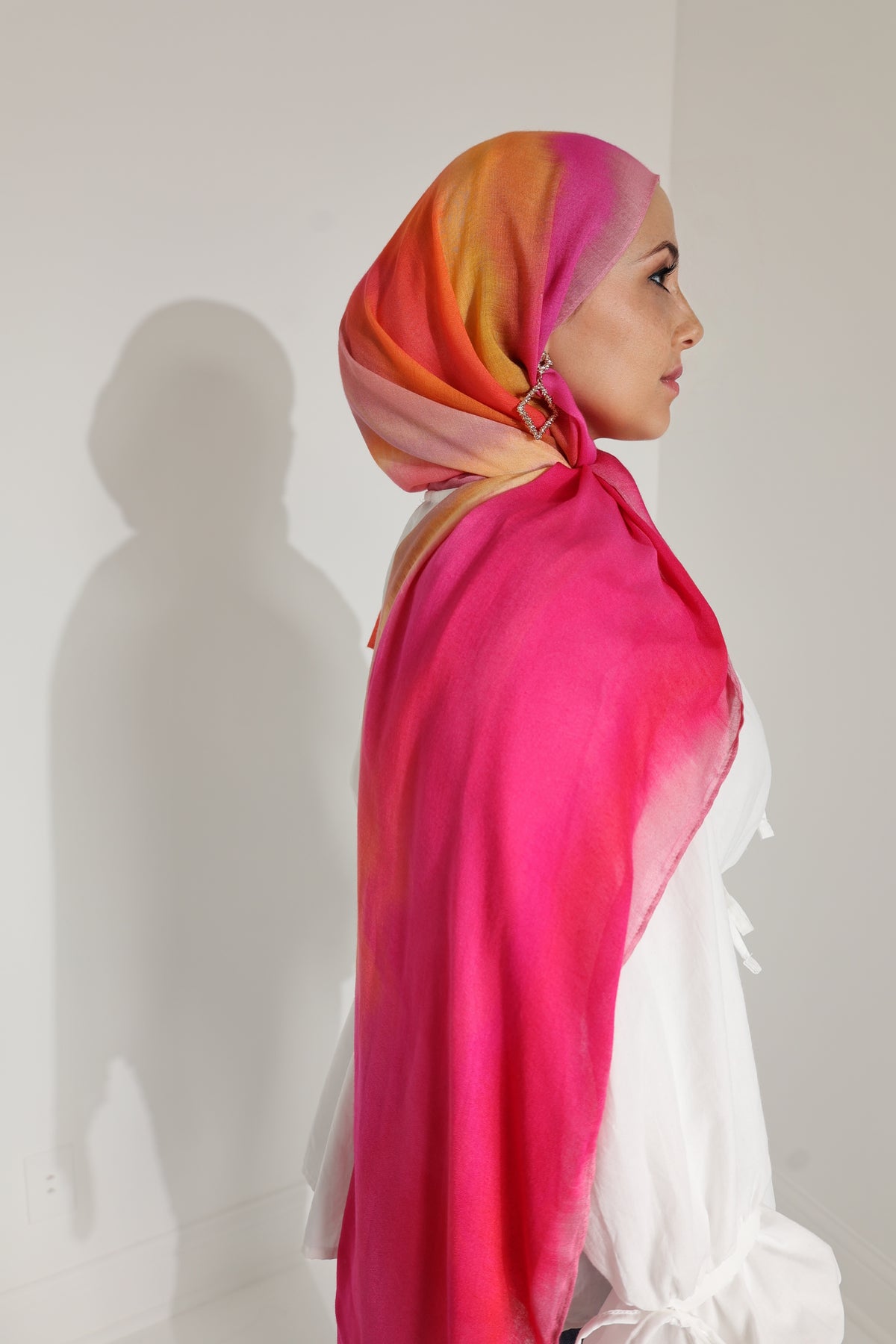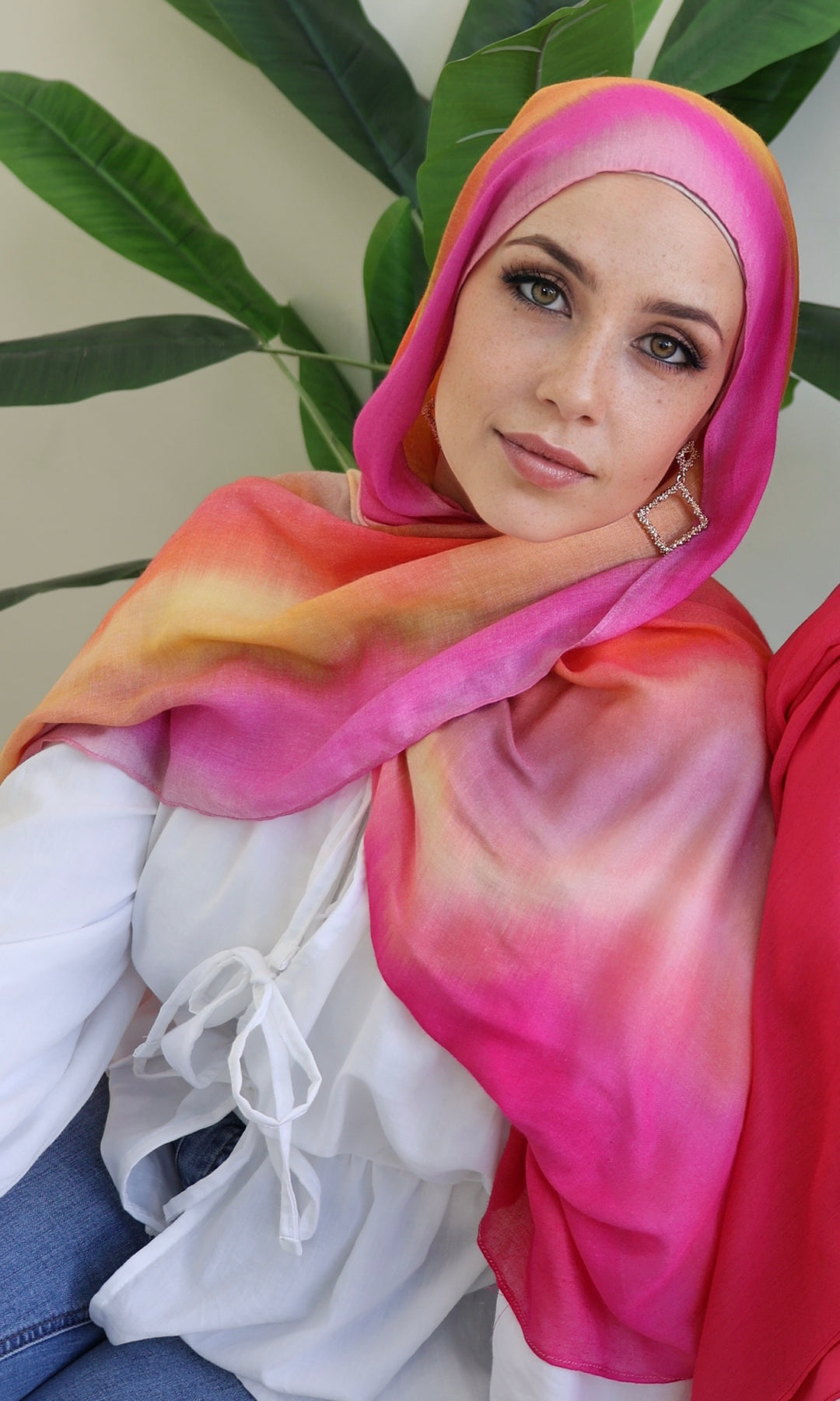 Vibrant, bold, and full of life — Tropical Sunset captures the fiery beauty of a summer sky. This eye-catching chiffon hijab features a stunning gradient of hot pink, golden yellow, and coral orange, blending together like a warm evening glow. Light, airy, and effortlessly drapable, it’s perfect for making a statement while staying cool and comfortable. Add a burst of color to your wardrobe with this dreamy, vacation-inspired piece.