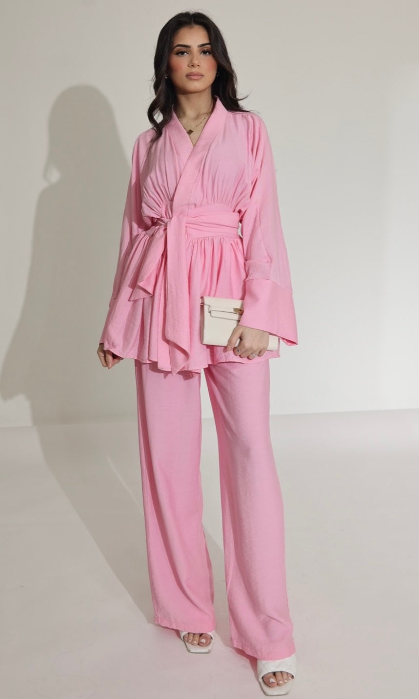 Effortlessly elegant and incredibly versatile, this two-piece linen set features a flowy wrap-style top paired with wide-leg trousers.