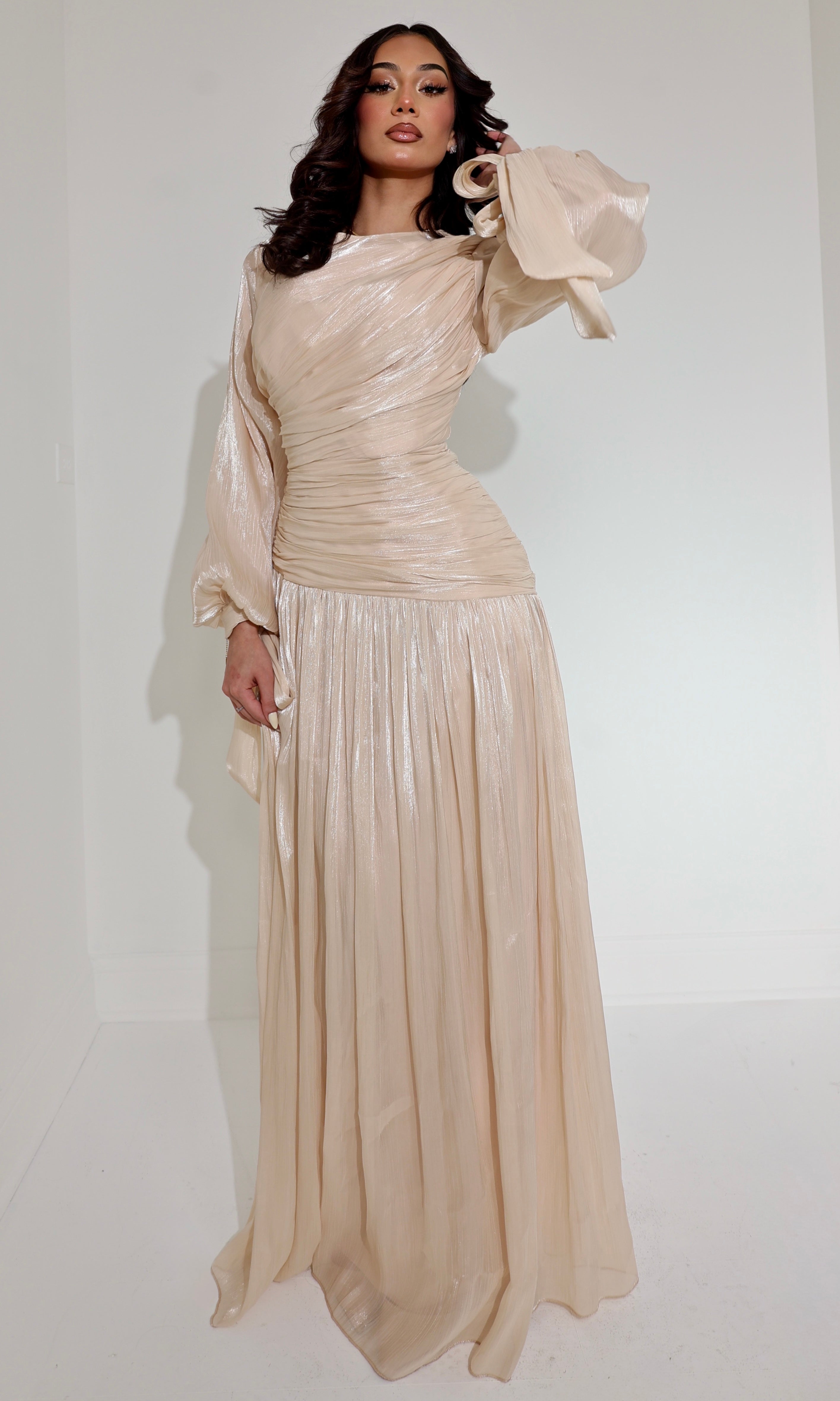 The delicately pleated bodice and attached waist tie create a flattering silhouette, while the skirt falls gracefully to the floor, ensuring an elegant and modest appearance. Ideal for formal events, weddings, and special occasions, this dress ensures you stand out with grace and poise.