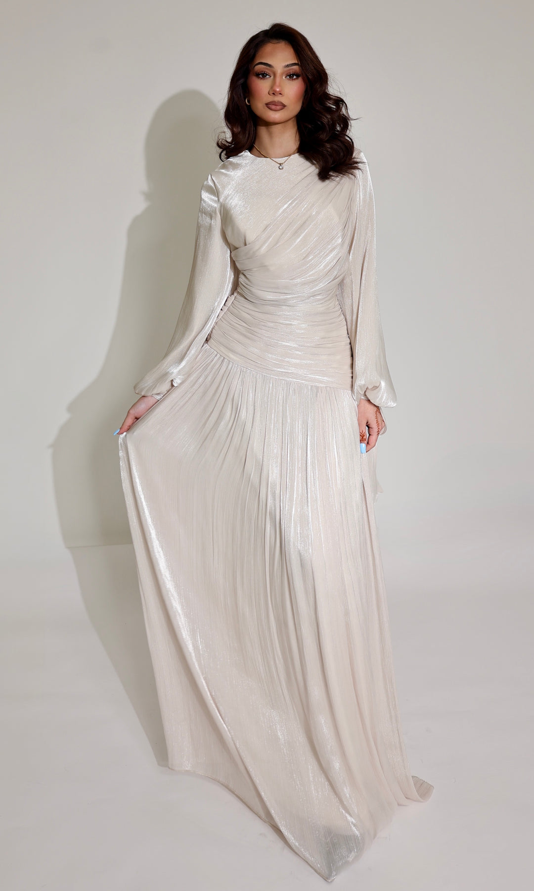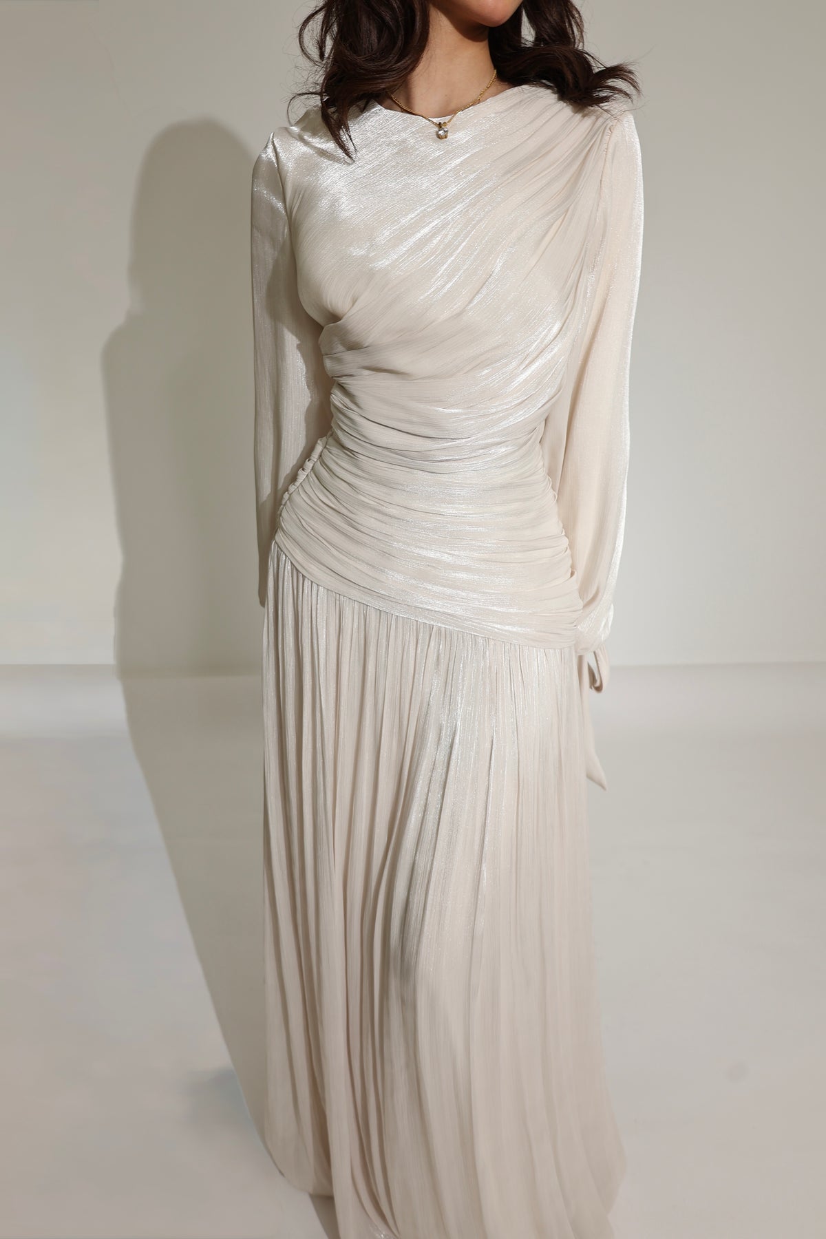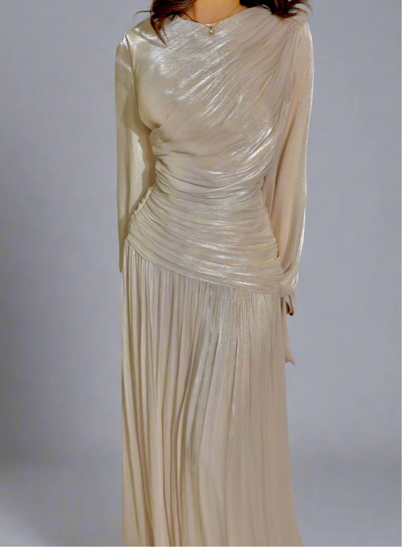Elevate your evening look with our Luxe Draped Pleated Gown, a masterpiece of grace and sophistication. Designed with a flattering asymmetric drape across the bodice, this full-length gown features a cinched waist and finely pleated skirt for a romantic, statuesque silhouette. Voluminous long sleeves with gathered cuffs add a touch of vintage charm, while the shimmering fabric catches the light with every movement, ensuring you turn heads at any occasion. Zipper in the back model 5’5 wearing xsmall