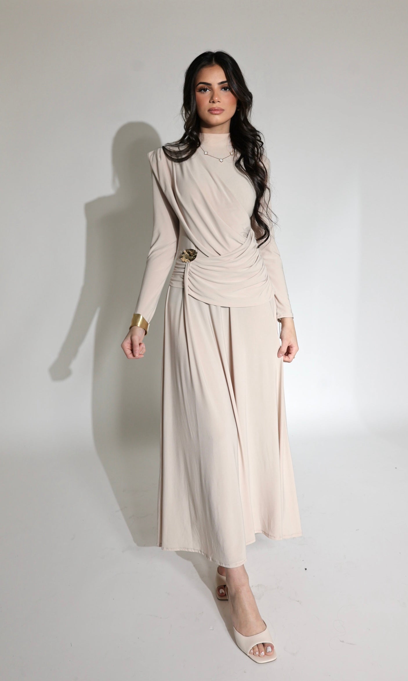Elevate your elegance with the Sculpted Grace Maxi Dress- a refined piece designed for timeless sophistication. Featuring a high neckline and long sleeves, this dress drapes beautifully with a flattering ruched waistline, accentuated by a chic gold-tone detail on the hip. The ankle length makes it perfect for formal occasions, weddings, or evening events.