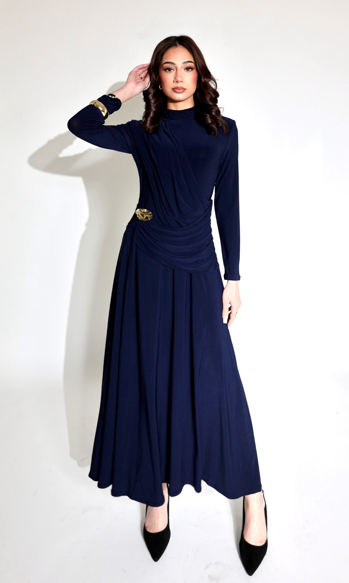 Elevate your elegance with the Sculpted Grace Maxi Dress- a refined piece designed for timeless sophistication. Featuring a high neckline and long sleeves, this dress drapes beautifully with a flattering ruched waistline, accentuated by a chic gold-tone detail on the hip. The ankle length makes it perfect for formal occasions, weddings, or evening events.