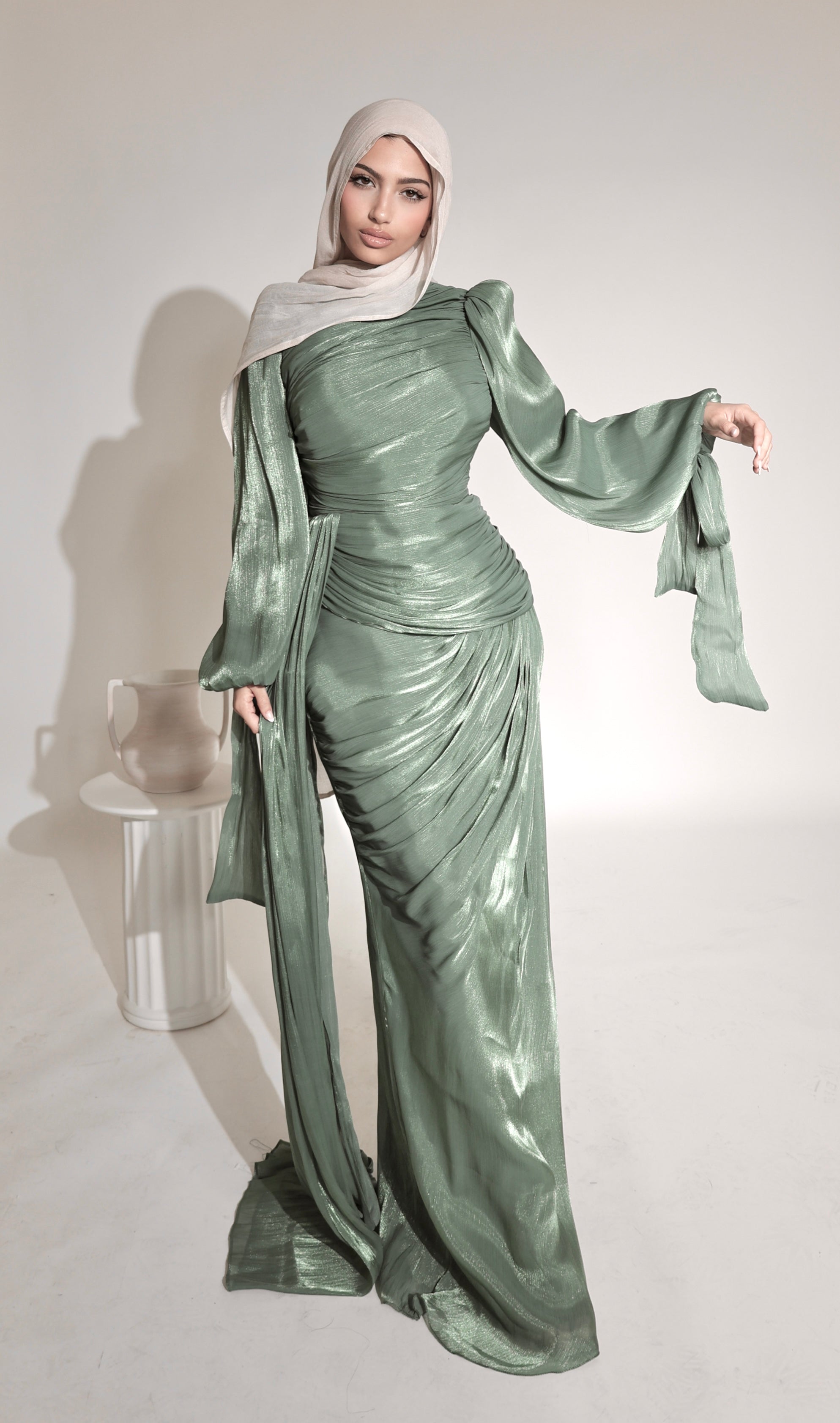 Our stunning dress features a sophisticated design that effortlessly combines elegance and modernity. It boasts a gracefully ruched bodice that accentuates the waist, creating a flattering silhouette. The full-length skirt flows beautifully and includes draped detailing, which adds a touch of ethereal charm to your look.
