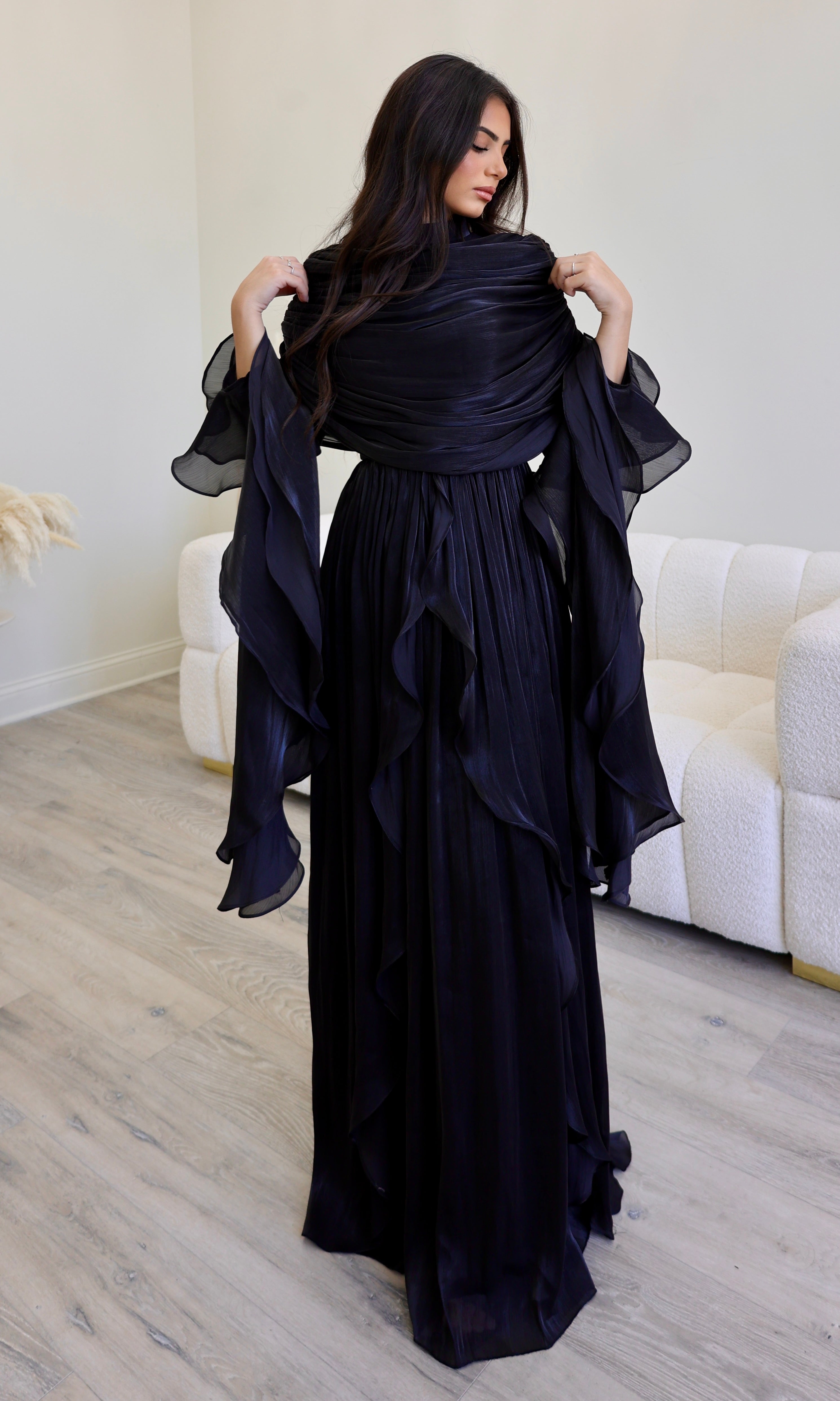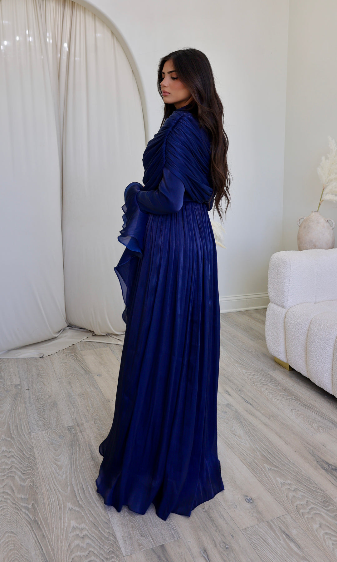 The soft, cascading sleeves and pleated skirt make this gown perfect for weddings, formal occasions, or evening events.