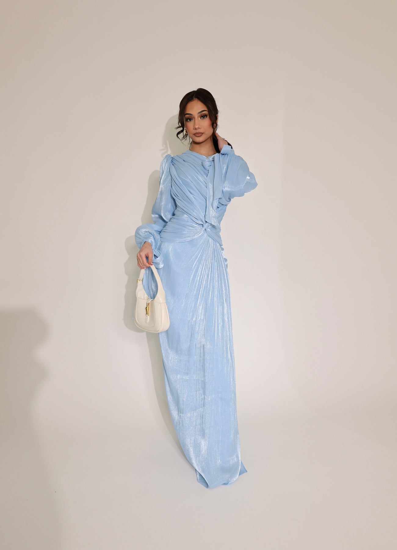 Introducing our stunning, Jasmina elegant gown, perfect for any occasion. This dress features a beautifully draped bodice with intricate, gathered fabric that creates a graceful, twisted knot at the waist, defining your silhouette with style and grace. The long, slightly puffed sleeves add a touch of romantic opulence, complete with delicate ties at the wrists for an extra flair. The skirt cascades gracefully to the floor, with soft pleats that add movement and flow to the entire ensemble.