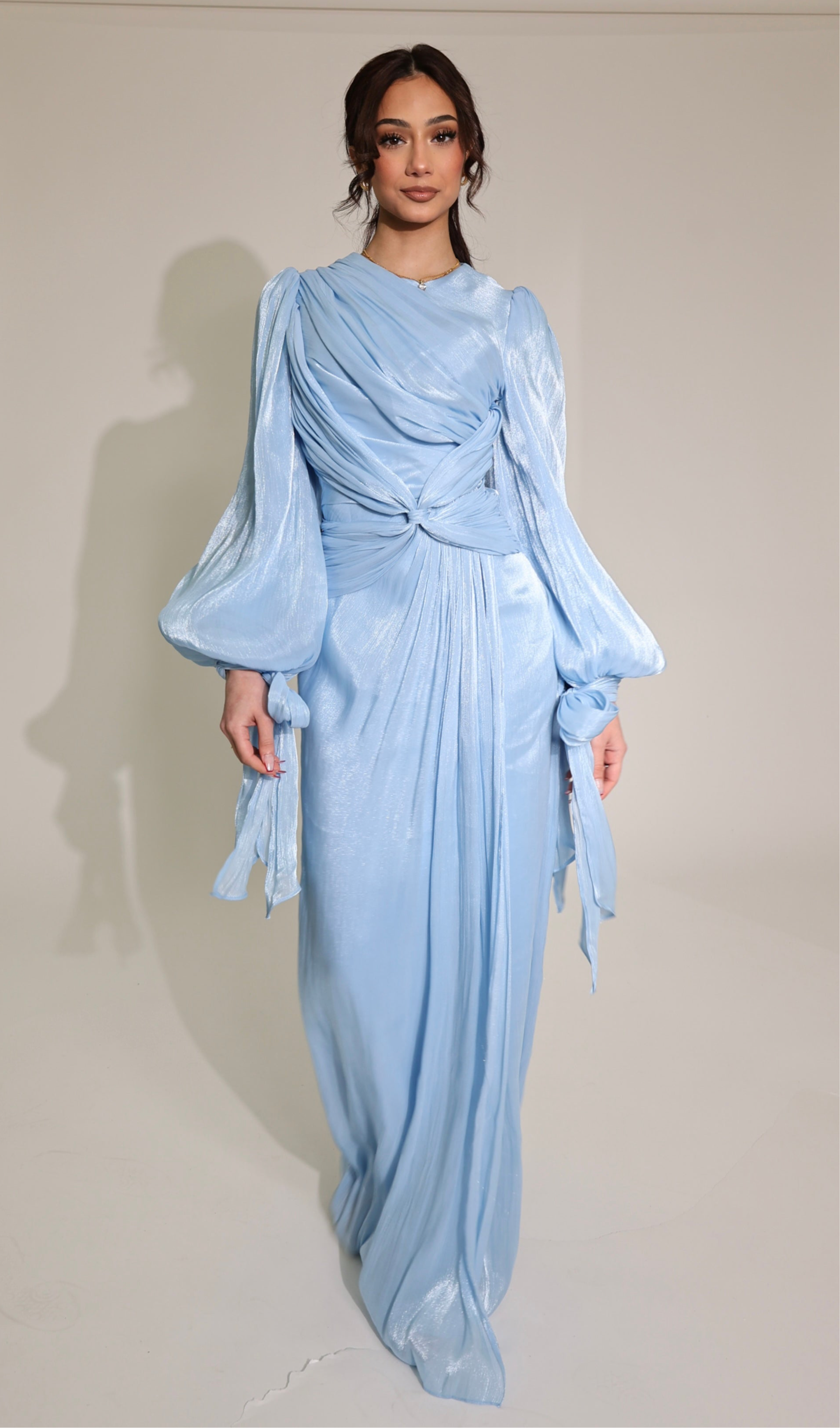 Introducing our stunning, Jasmina elegant gown, perfect for any occasion. This dress features a beautifully draped bodice with intricate, gathered fabric that creates a graceful, twisted knot at the waist, defining your silhouette with style and grace. The long, slightly puffed sleeves add a touch of romantic opulence, complete with delicate ties at the wrists for an extra flair. The skirt cascades gracefully to the floor, with soft pleats that add movement and flow to the entire ensemble.