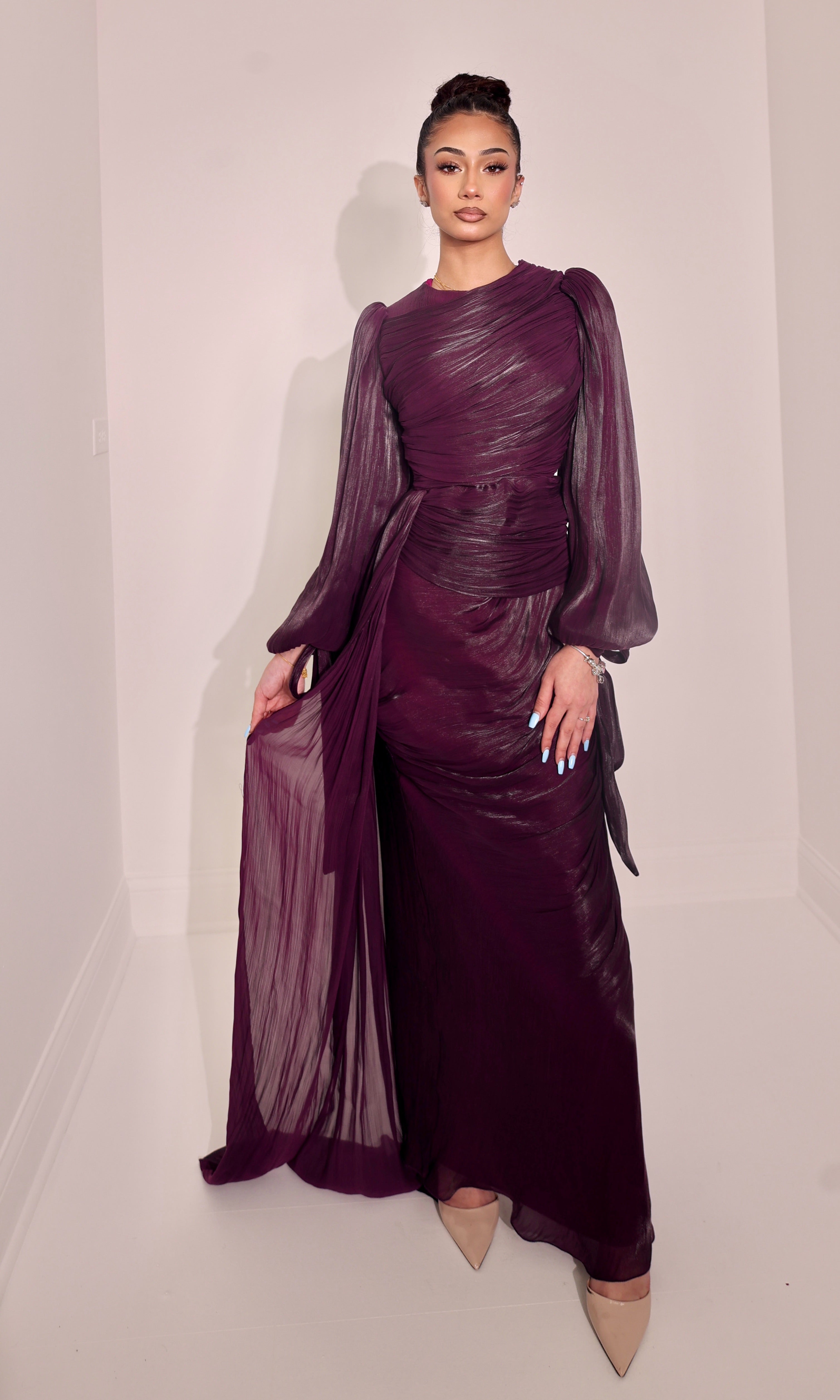 Elevate your evening look with this stunning floor-length gown, designed with a glamorous side cape that flows effortlessly for dramatic movement. The metallic shimmer fabric, elegant high neckline, and gathered draping at the waist flatter every silhouette. With long sleeves and a timeless silhouette, this gown blends modesty and luxury in the most graceful way.