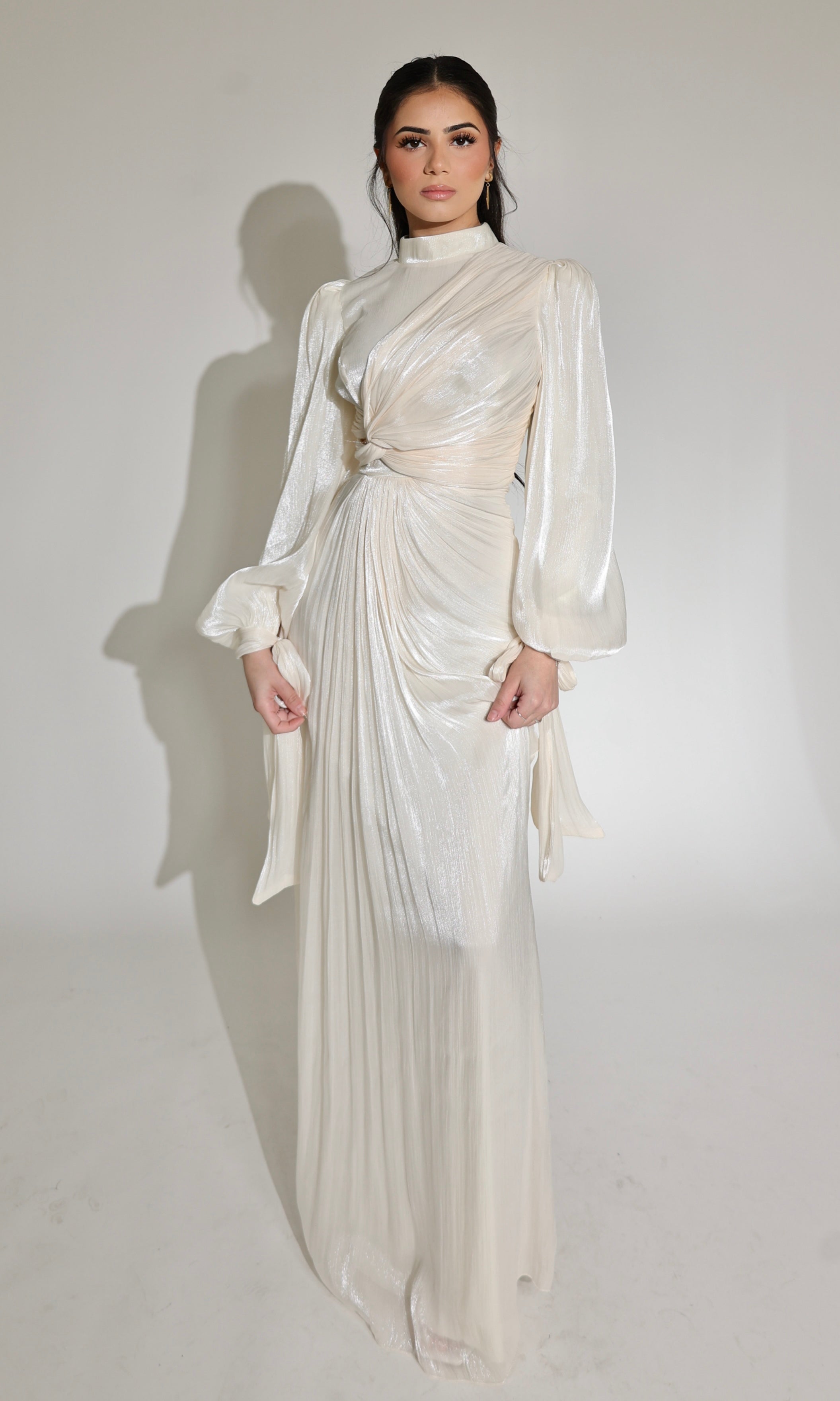Introducing our stunning, Sabrina elegant gown, perfect for any occasion. This dress features a beautifully draped bodice with intricate, gathered fabric that creates a graceful, twisted knot at the cheat, defining your silhouette with style and grace. The long, slightly puffed sleeves add a touch of romantic opulence, complete with delicate ties at the wrists for an extra flair. The skirt cascades gracefully to the floor, with soft pleats that add movement and flow to the entire ensemble.