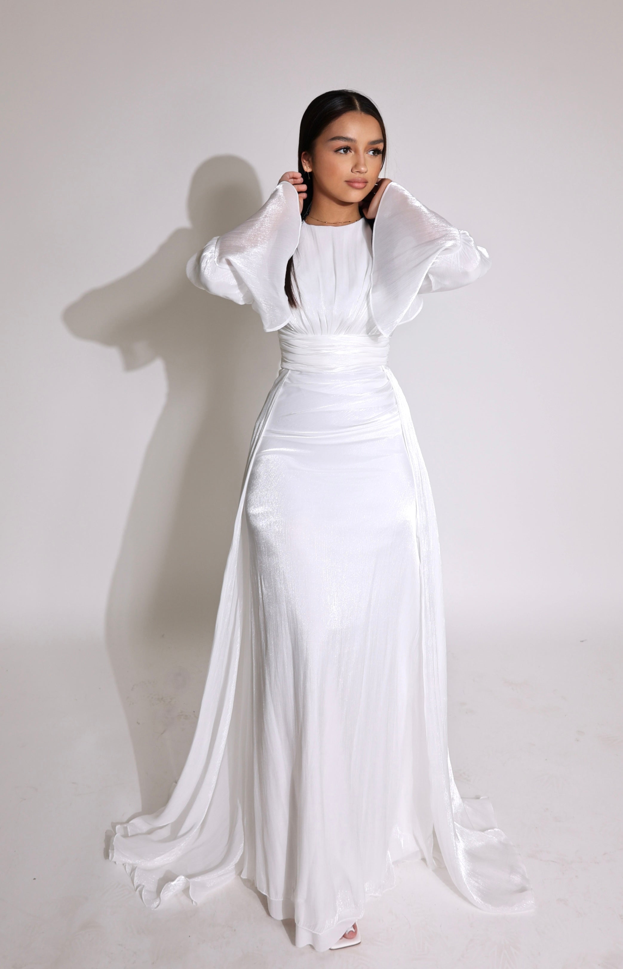 Our stunning dress features a sophisticated design that effortlessly combines elegance and modernity. It boasts a gracefully ruched bodice that accentuates the waist, creating a flattering silhouette. The full-length skirt flows beautifully and includes draped detailing, which adds a touch of ethereal charm to your look.