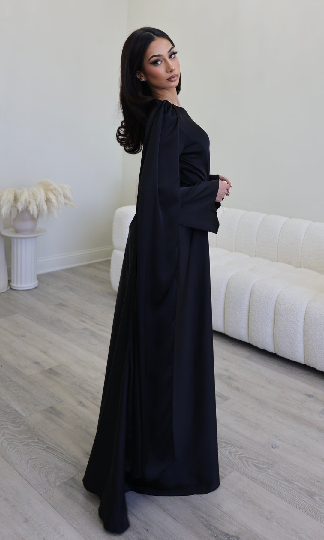 This stunning floor-length gown is designed with a versatile attached draped cape, allowing you to style it in multiple ways for different looks. The cape is seamlessly connected to the dress, giving you the option to drape it over the shoulder, let it flow freely, or wrap it around for added coverage.