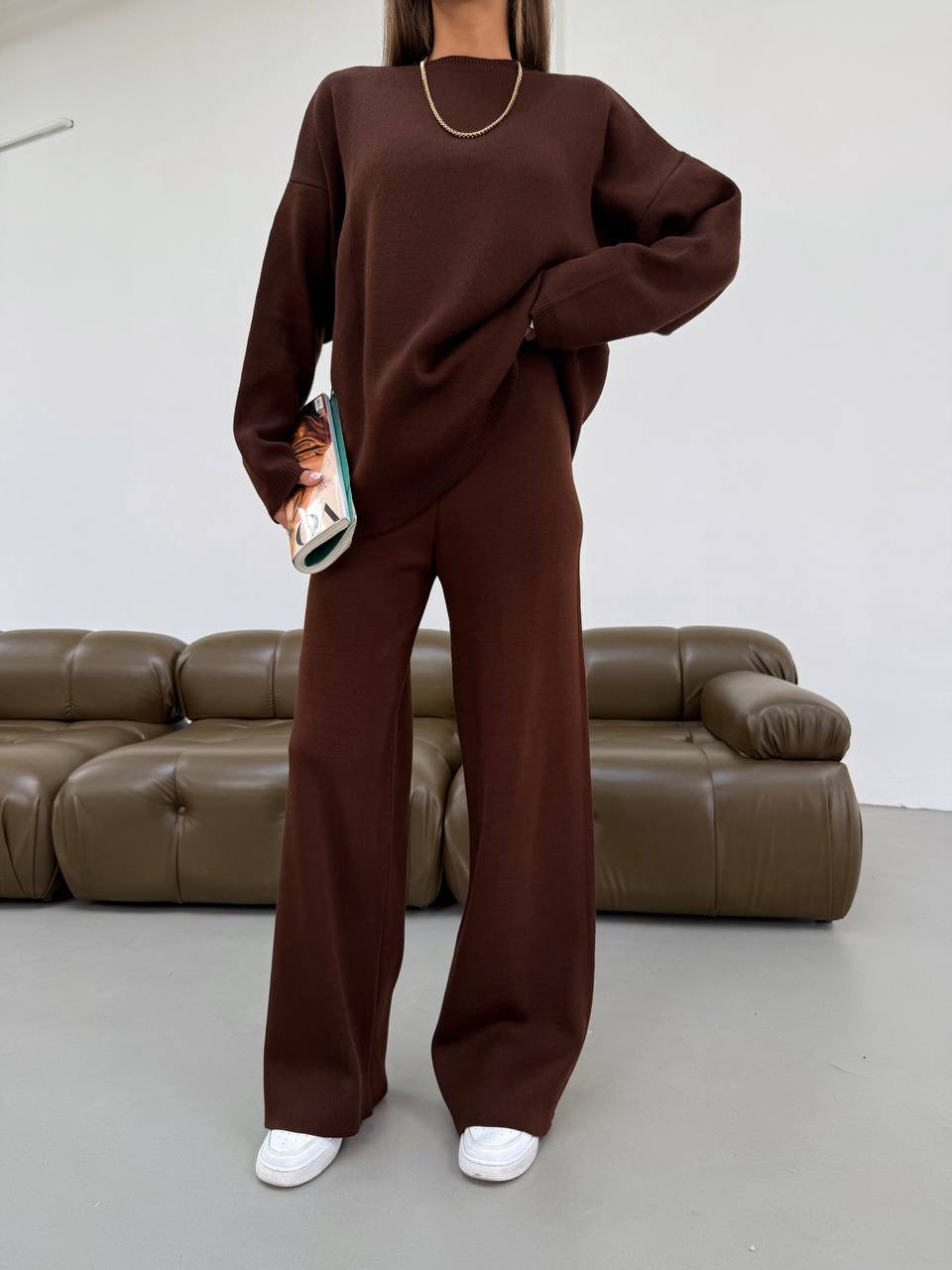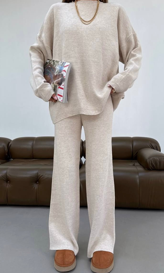 Stay cozy and chic in this stylish two-piece knit set, designed in a standard size for a relaxed yet flattering fit. The set includes a soft drop-shoulder sweater and matching wide-leg pants, offering the perfect balance of comfort and sophistication.