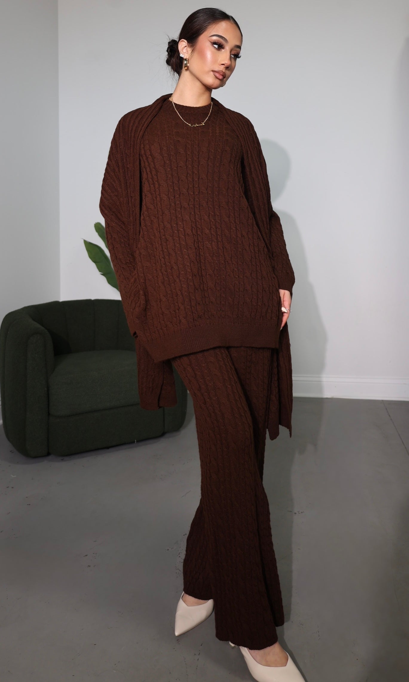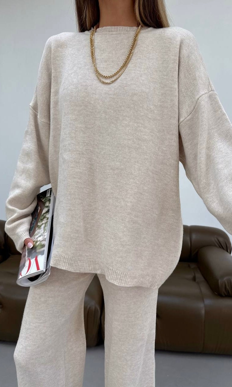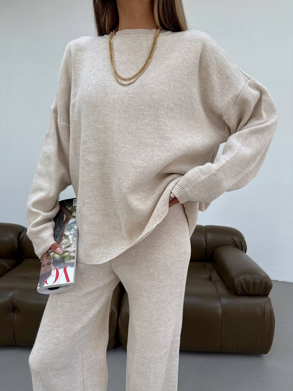 Stay cozy and chic in this stylish two-piece knit set, designed in a standard size for a relaxed yet flattering fit. The set includes a soft drop-shoulder sweater and matching wide-leg pants, offering the perfect balance of comfort and sophistication.