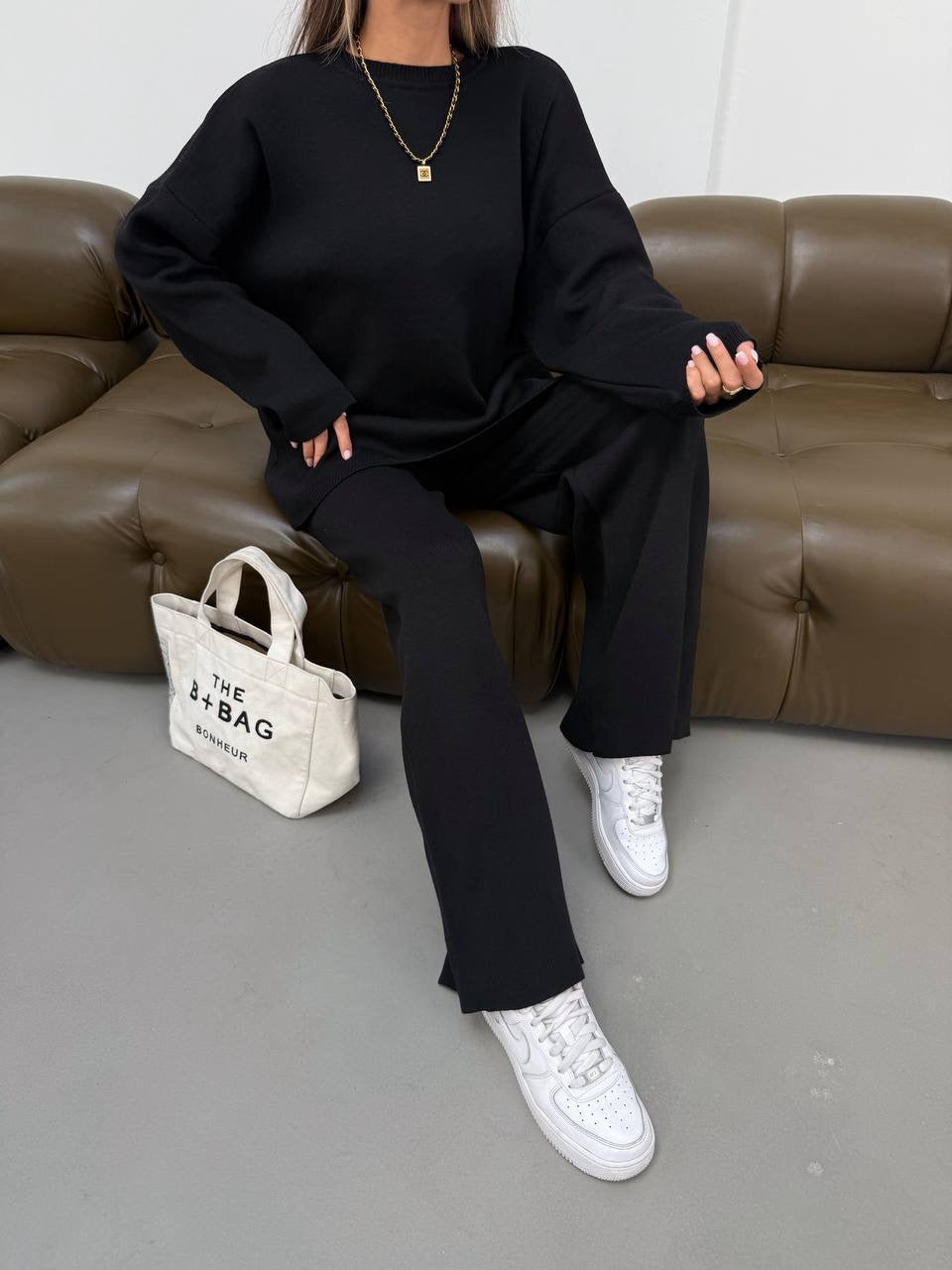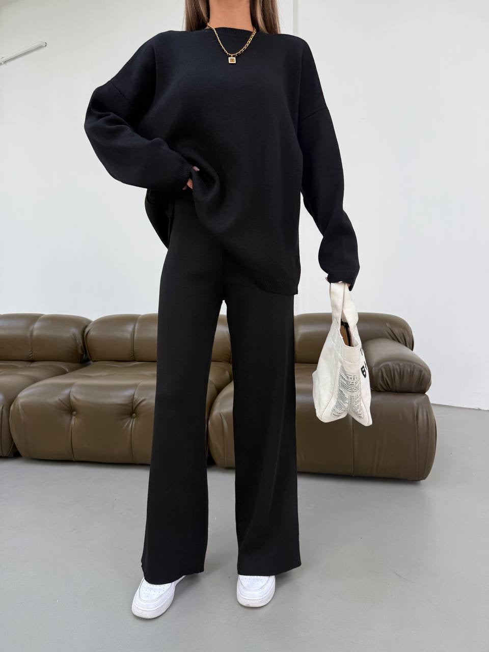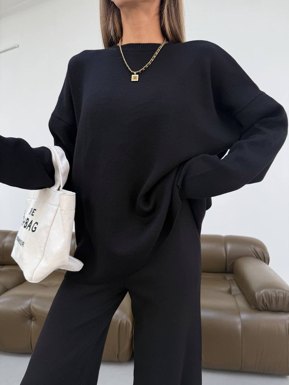 Stay cozy and chic in this stylish two-piece knit set, designed in a standard size for a relaxed yet flattering fit. The set includes a soft drop-shoulder sweater and matching wide-leg pants, offering the perfect balance of comfort and sophistication.