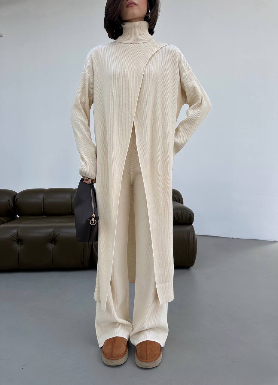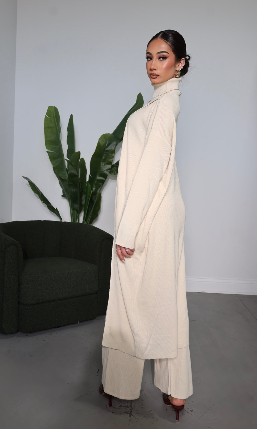 Stay cozy and chic with this elegant 2-piece set, featuring a rich burgundy color perfect for fall and winter. The set includes a soft ribbed turtleneck Maxi top, wide-leg pants for effortless layering. Designed for both comfort and style, this standard-size outfit is ideal for casual outings, coffee dates, or lounging in style.