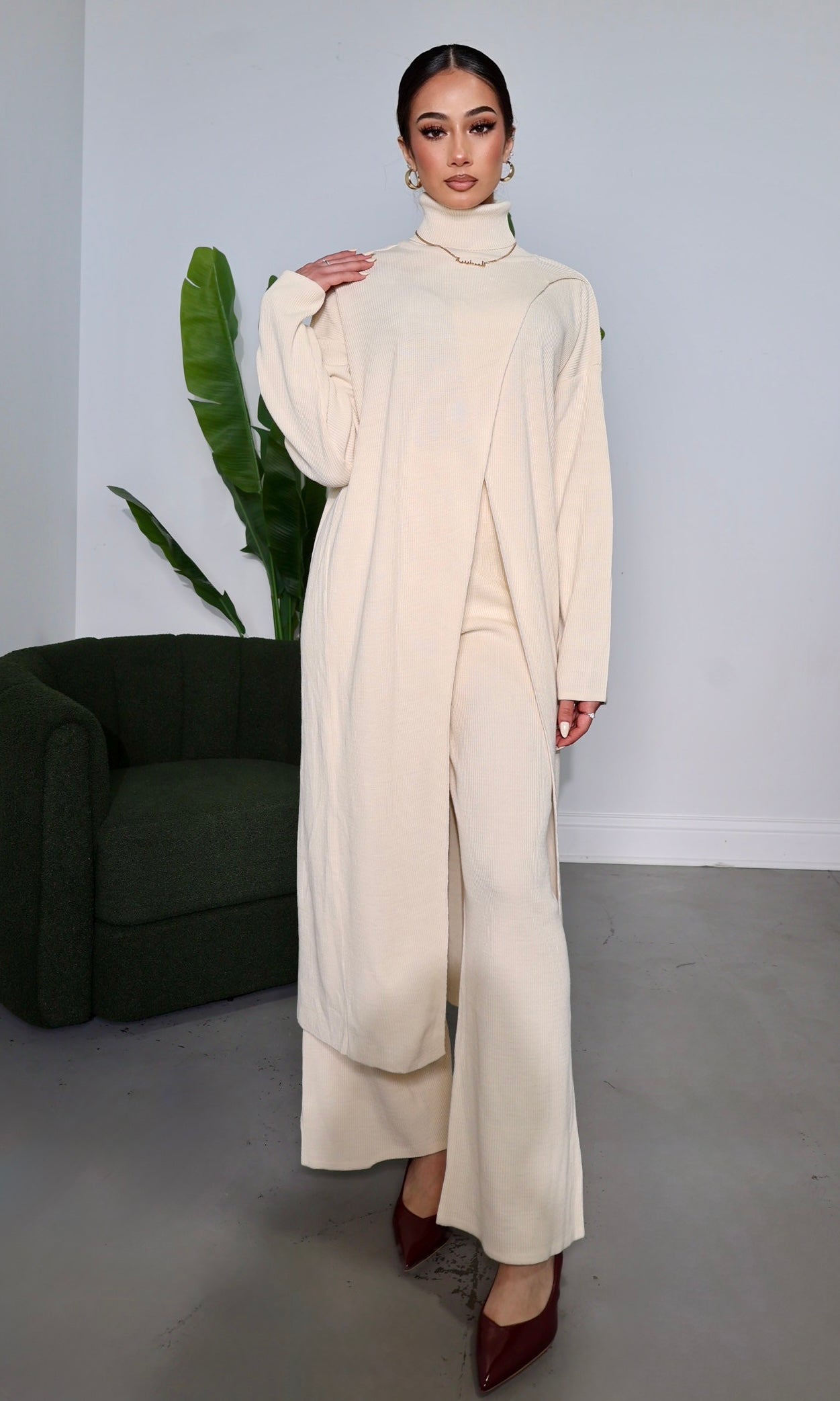 Stay cozy and chic with this elegant 2-piece set, featuring a rich burgundy color perfect for fall and winter. The set includes a soft ribbed turtleneck Maxi top, wide-leg pants for effortless layering. Designed for both comfort and style, this standard-size outfit is ideal for casual outings, coffee dates, or lounging in style.
