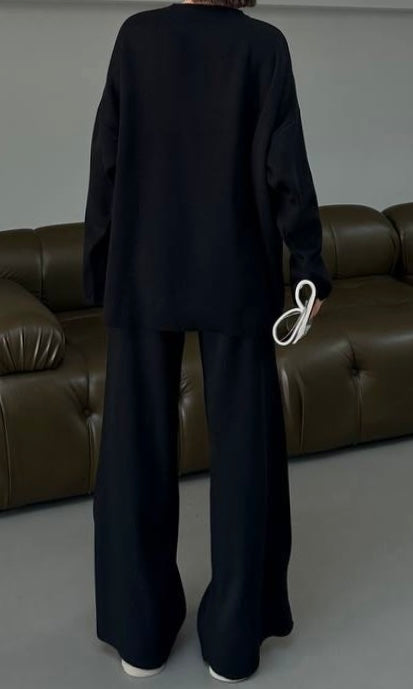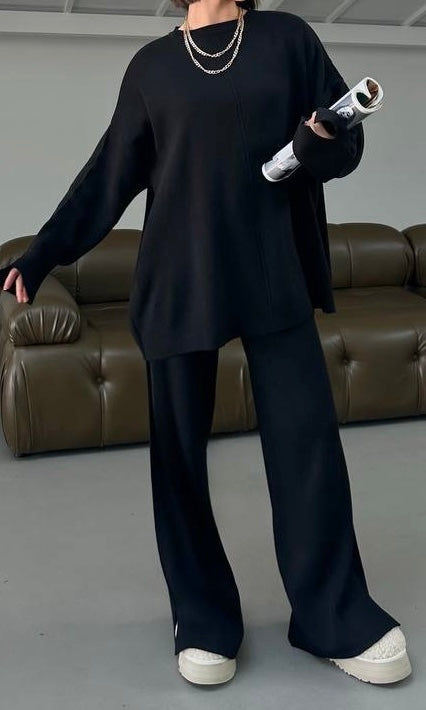 Cozy yet effortlessly chic, this two-piece knit set is designed for ultimate comfort and style. The top features a relaxed, oversized fit with a clean center seam and modern slit details on the sleeves, adding a subtle edge. The matching wide-leg pants are tailored with sleek front seams and side slits at the hem for a flattering, elongating look.