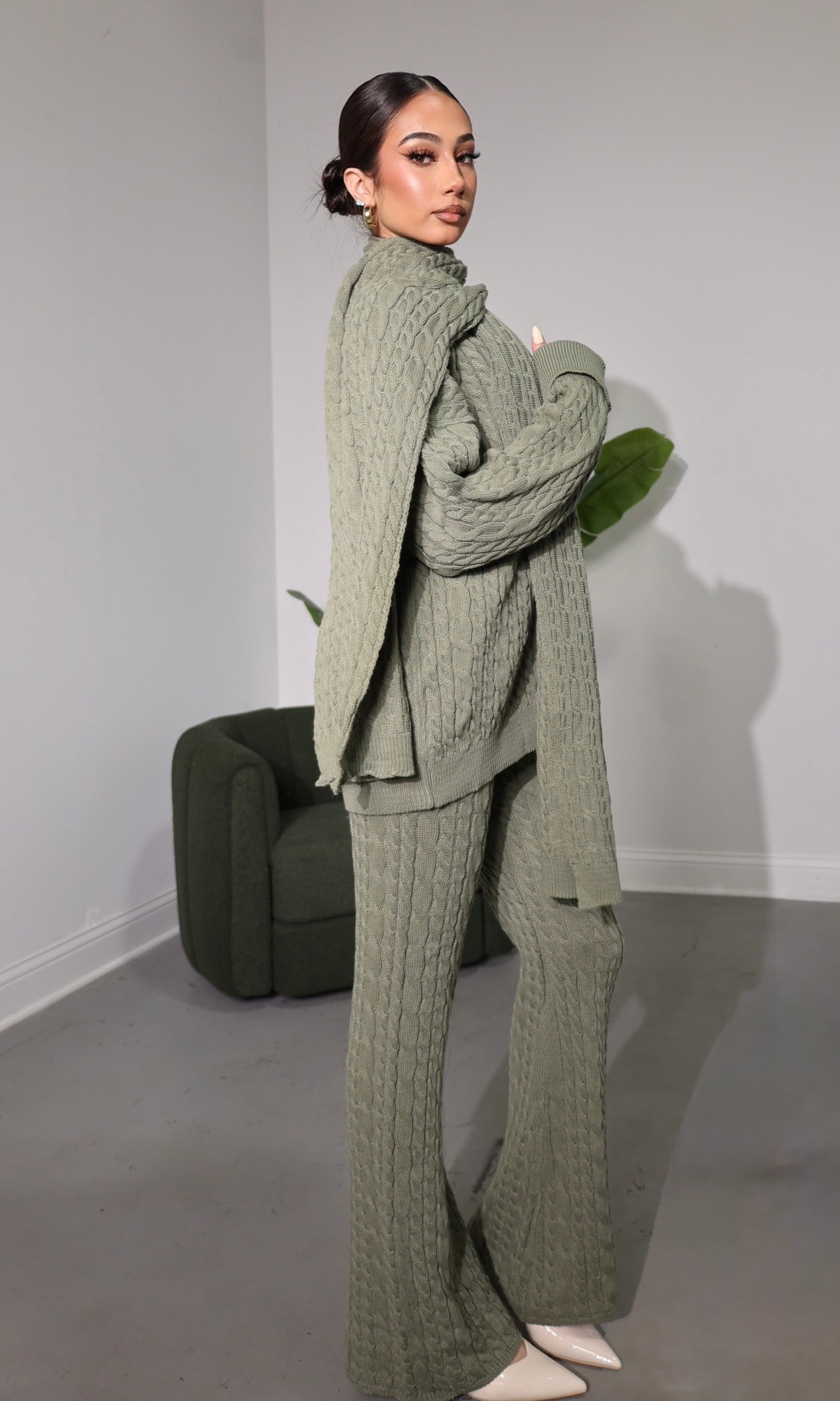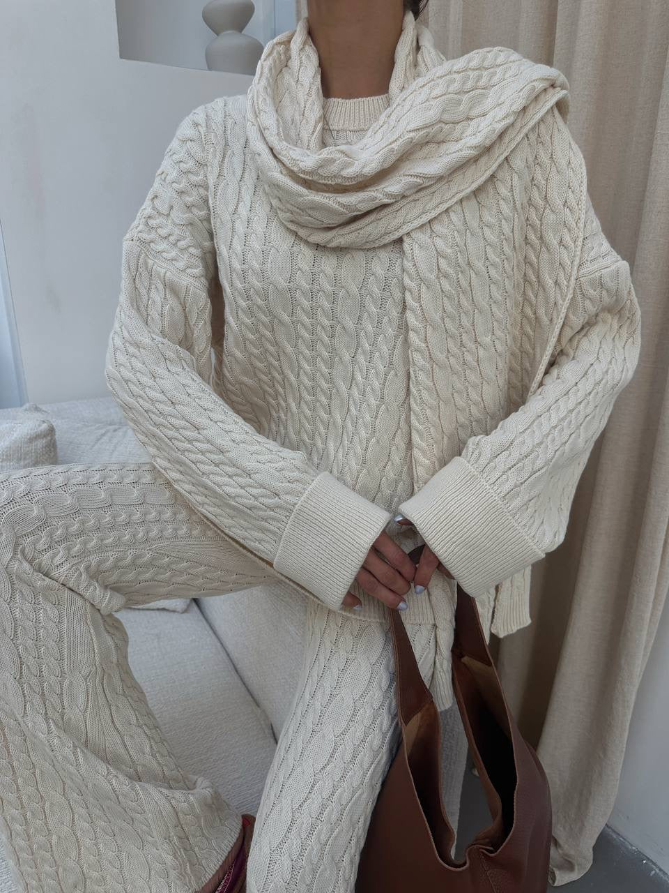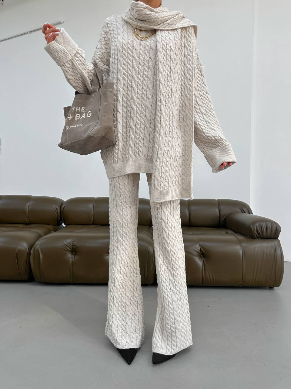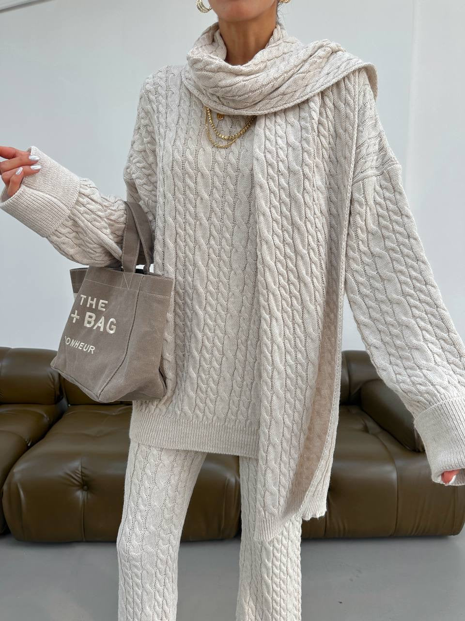 Stay warm and stylish with this 3-piece cable-knit set designed for all-day comfort and effortless chic. The set includes: