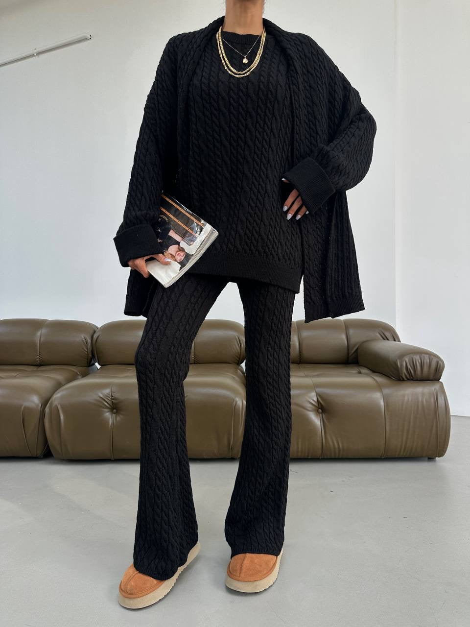 Stay warm and stylish with this 3-piece cable-knit set designed for all-day comfort and effortless chic. The set includes: