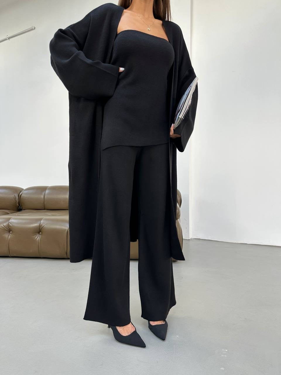 Step into effortless elegance with this three-piece set designed for comfort and style. Crafted in a soft fabric, this set features a wide-leg pant, a matching tube-style top, and a long open cardigan with flowy sleeves for a relaxed yet chic look. Perfect for casual outings or elevated everyday wear, this versatile ensemble can be styled together for a coordinated look or mixed and matched with other pieces in your wardrobe.