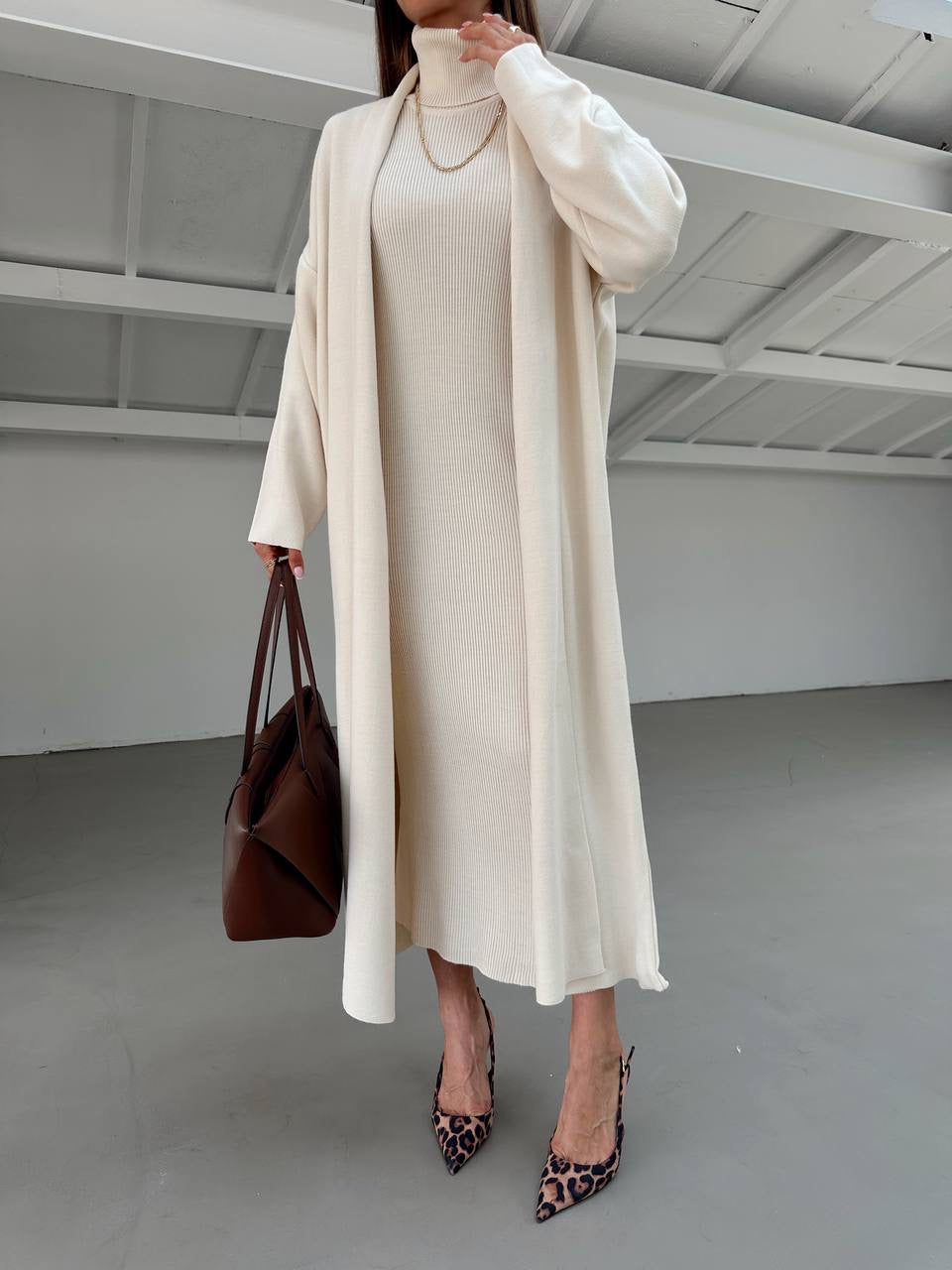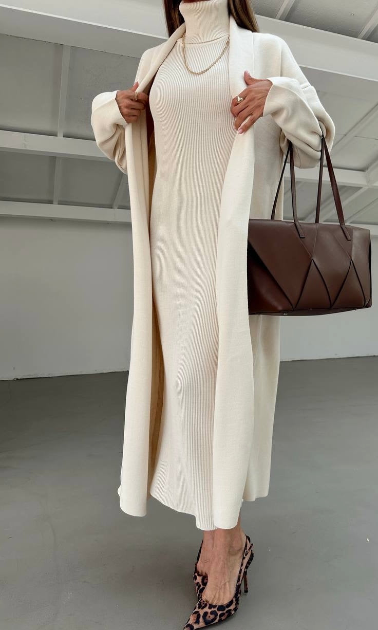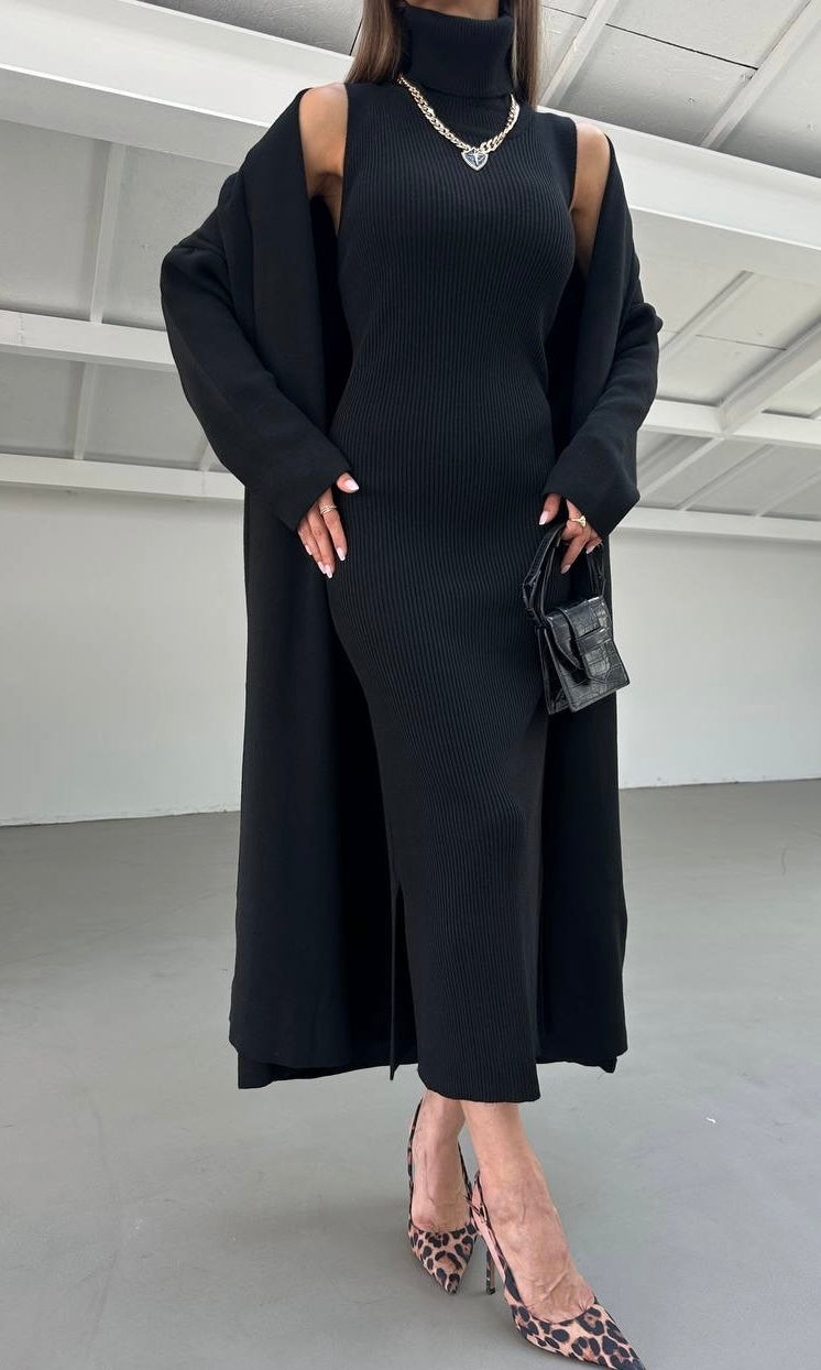 A stylish two-piece knit set that combines comfort and elegance. Featuring a sleeveless turtleneck dress with side slits and a matching long cardigan, perfect for layering and creating a polished, effortless look.