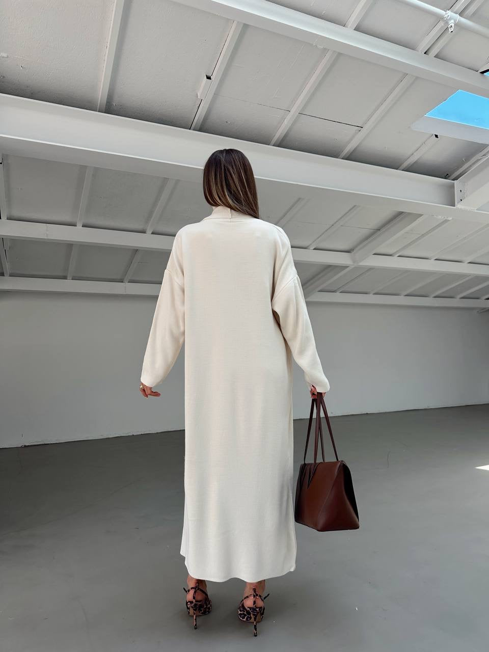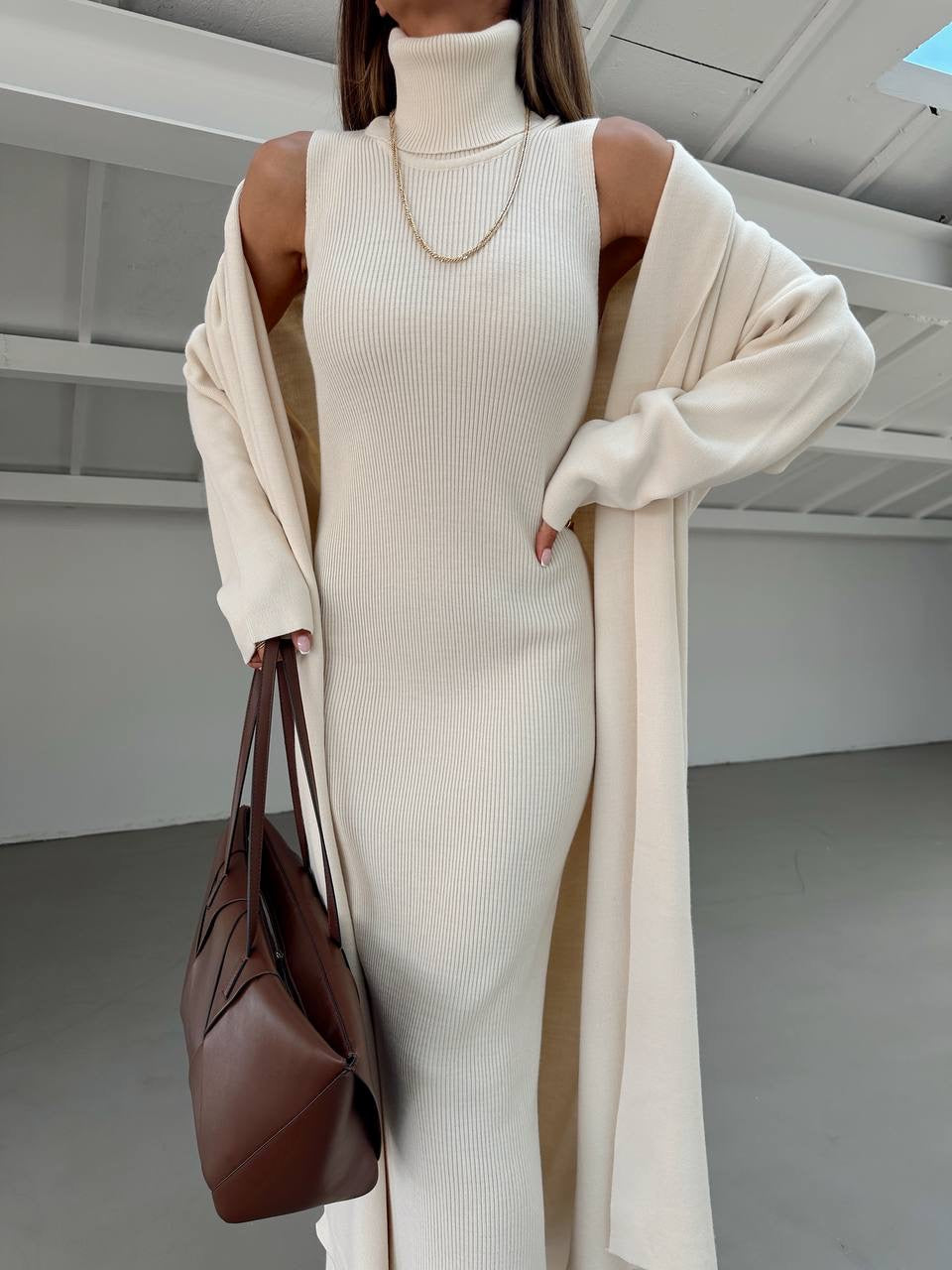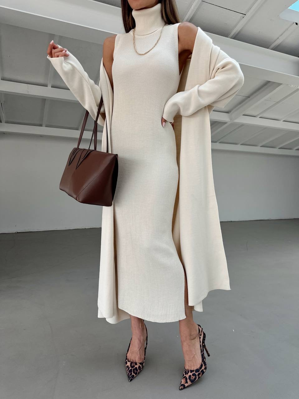 A stylish two-piece knit set that combines comfort and elegance. Featuring a sleeveless turtleneck dress with side slits and a matching long cardigan, perfect for layering and creating a polished, effortless look.