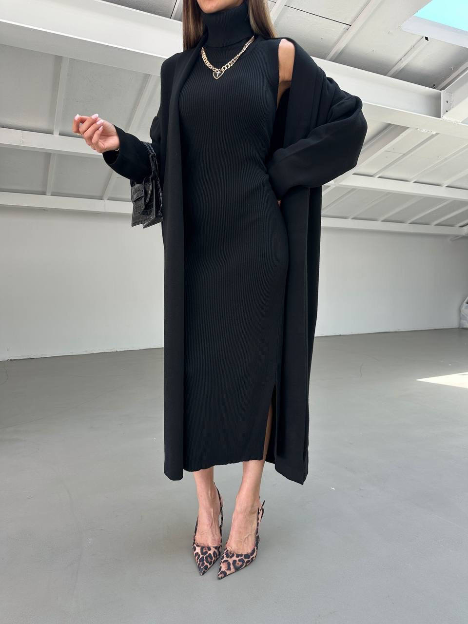 A stylish two-piece knit set that combines comfort and elegance. Featuring a sleeveless turtleneck dress with side slits and a matching long cardigan, perfect for layering and creating a polished, effortless look.