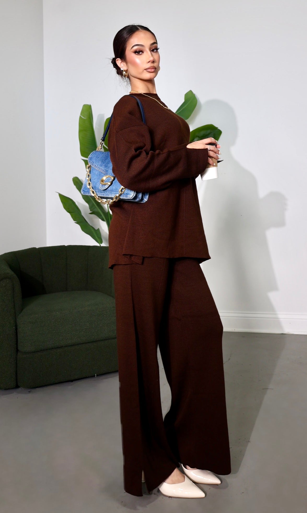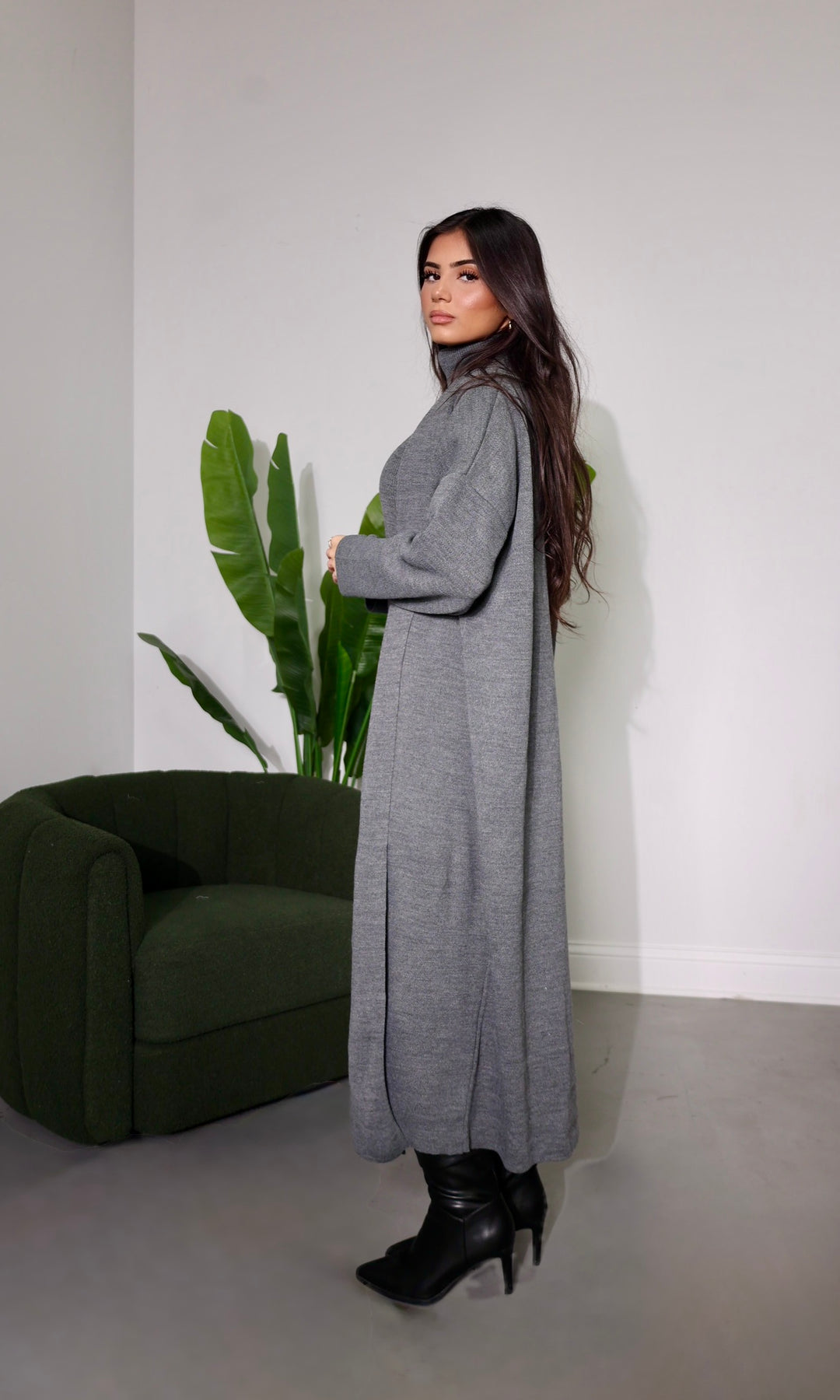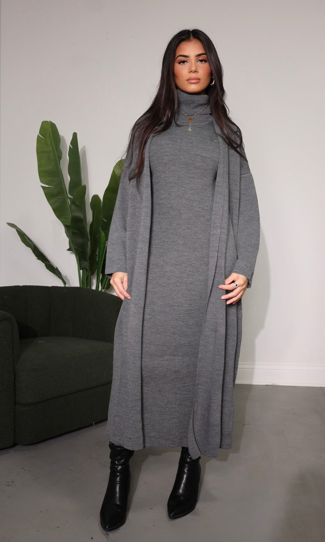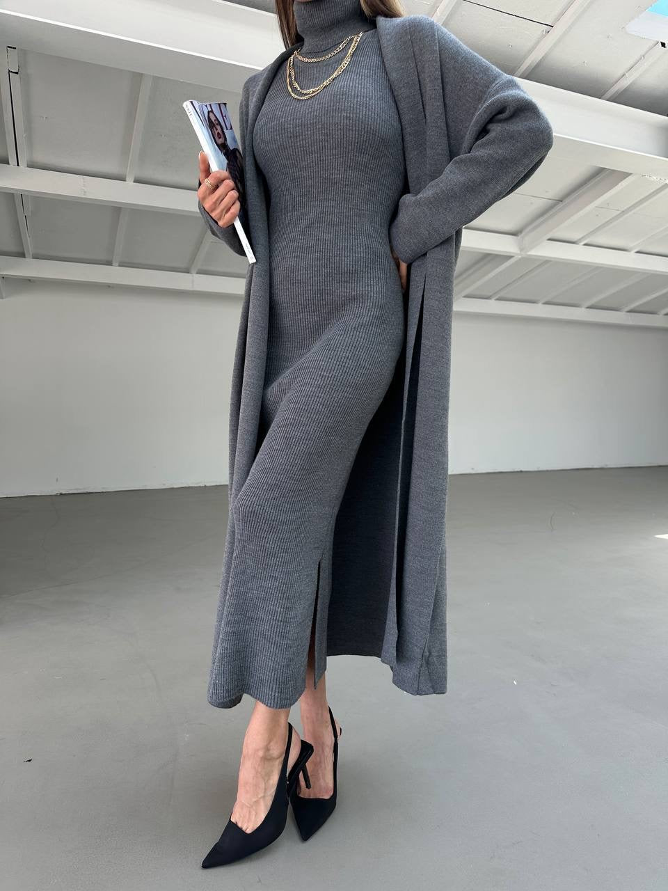 A stylish two-piece knit set that combines comfort and elegance. Featuring a sleeveless turtleneck dress with side slits and a matching long cardigan, perfect for layering and creating a polished, effortless look.