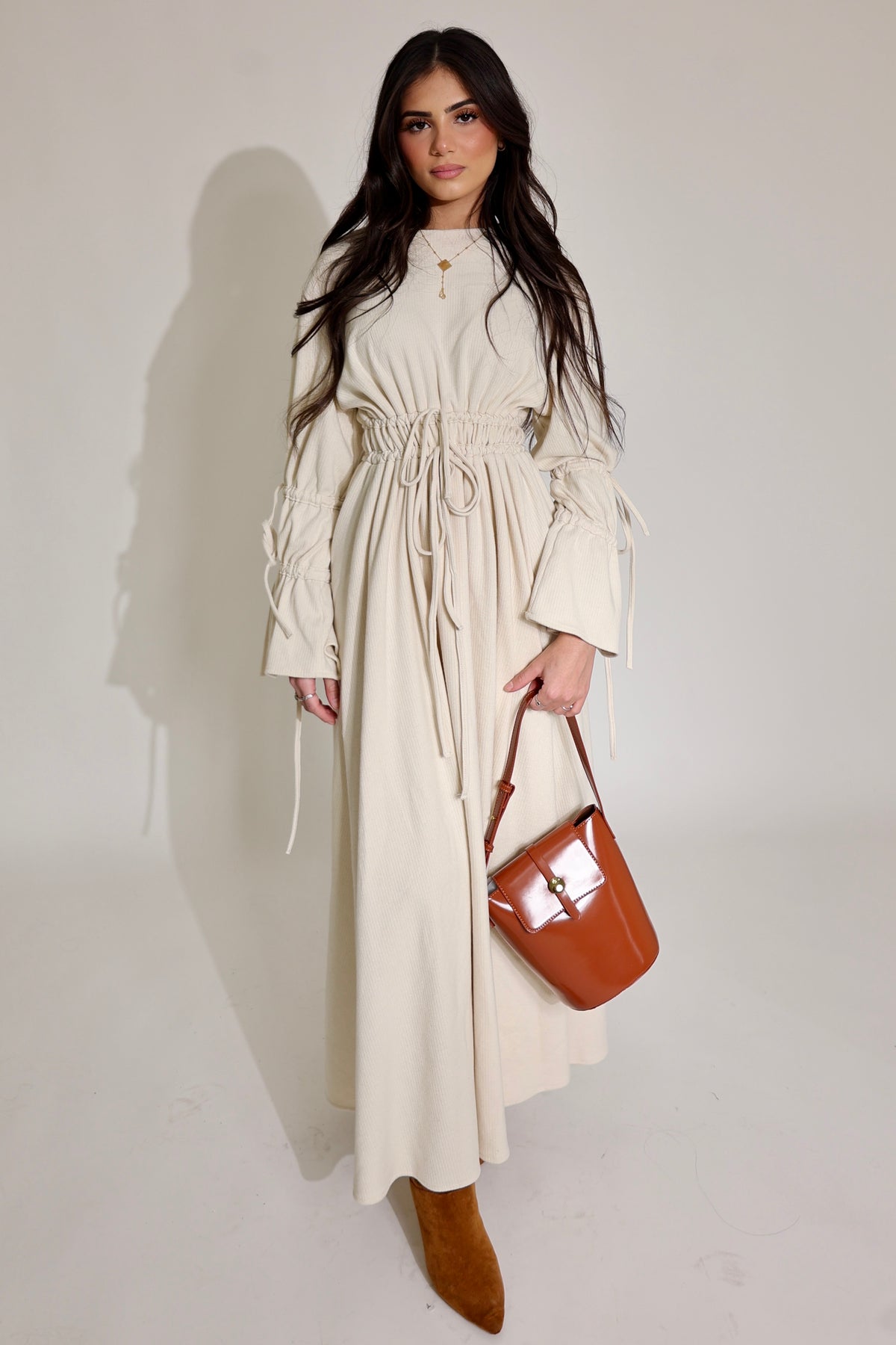 Your new everyday comfort dress. This maxi comes intentionally oversized for a loose, flowy fit — then cinches beautifully at the waist and sleeves with adjustable drawstrings so you can tighten it to your liking. The result is a flattering, effortless silhouette that works on every body.