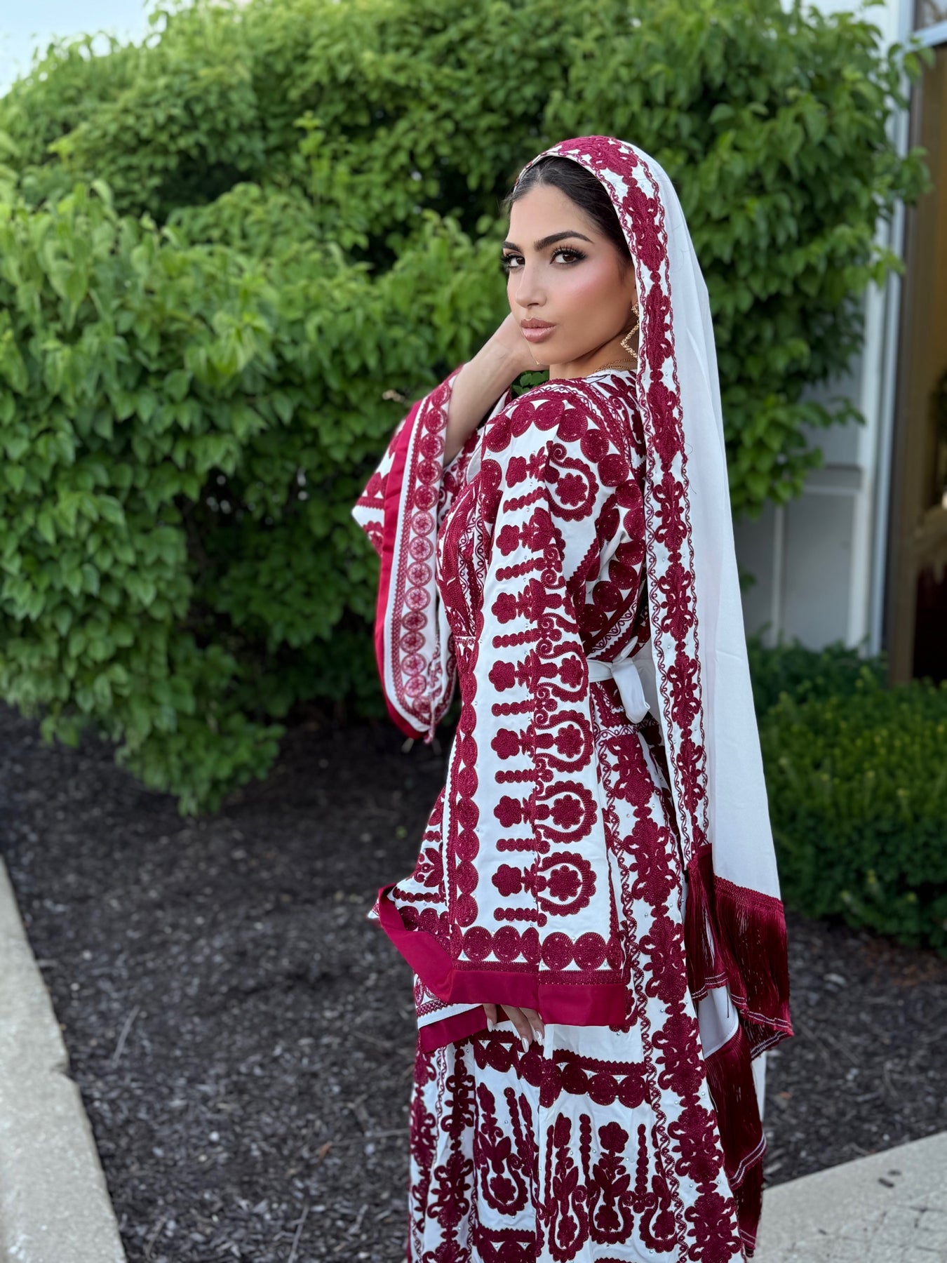 Step into cultural elegance with this beautifully handcrafted Palestinian thobe, featuring rich crimson embroidery on a crisp cream base. This timeless piece showcases traditional tatreez patterns with stunning precision, celebrating heritage through every stitch.
