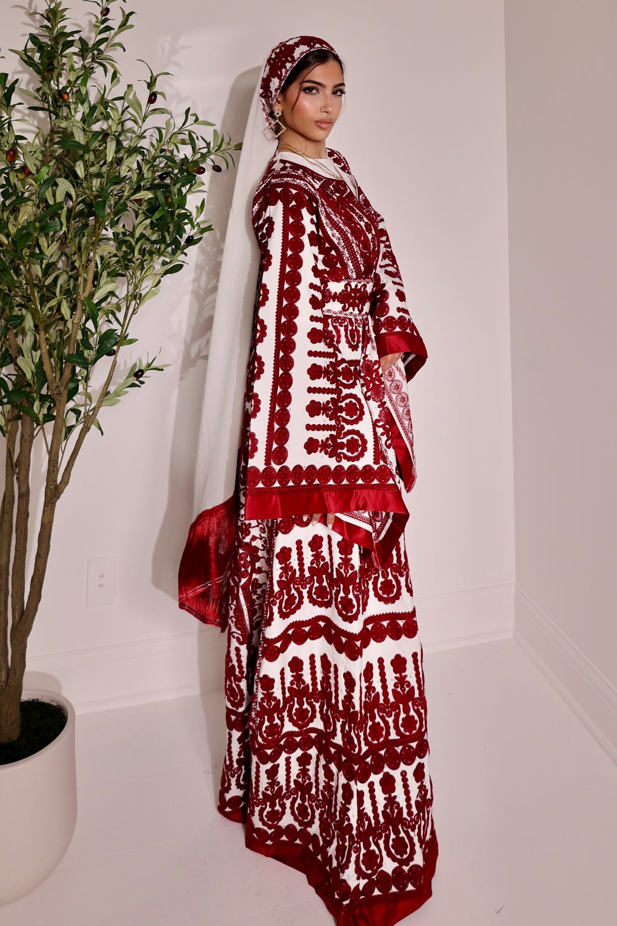 Palestinian Embroidered Thobe – Crimson & Cream Elegance