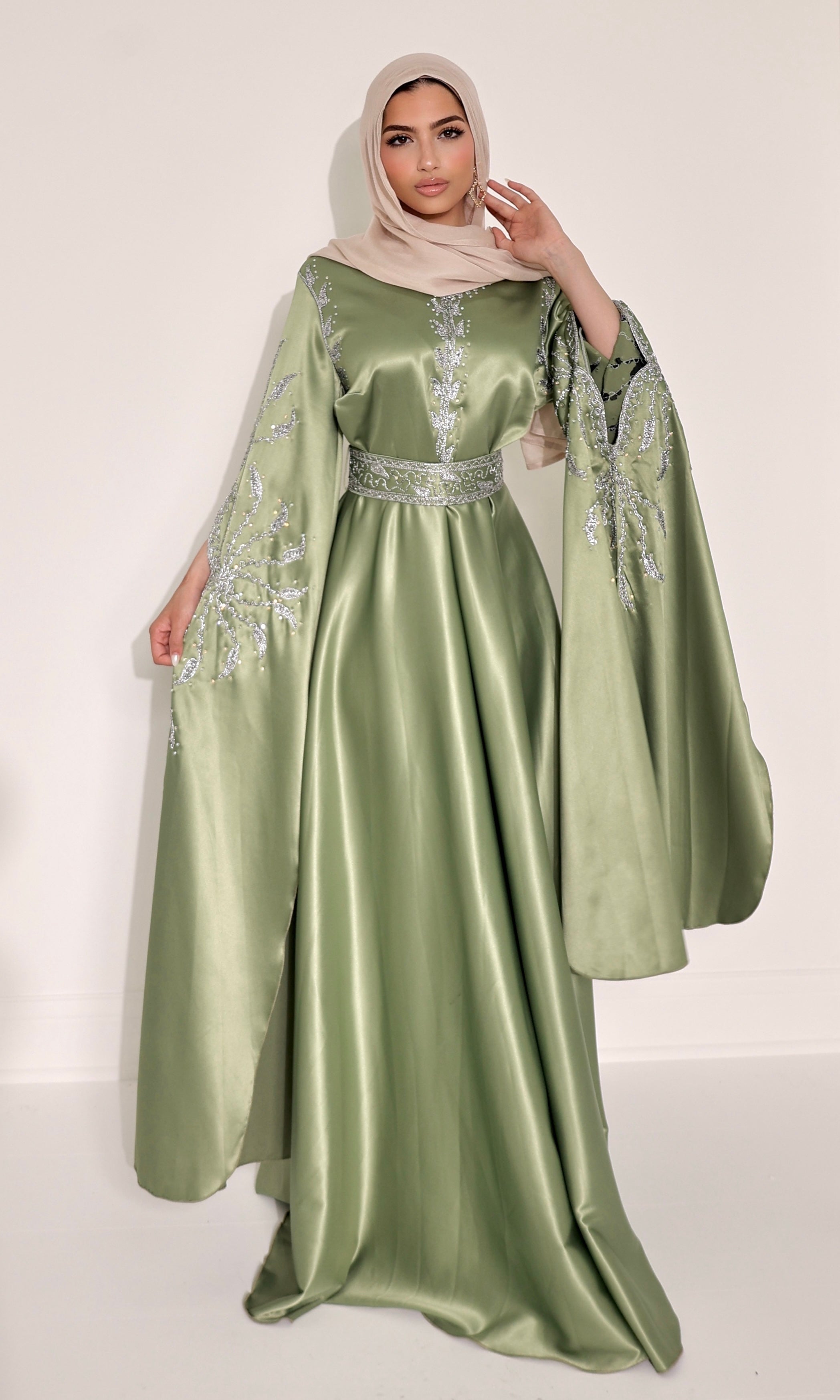 Designed with wide bell sleeves and a flattering A-line silhouette, the dress offers both comfort and sophistication. It includes a matching embroidered headscarf with velvet tassel detailing for a complete and graceful look. Perfect for weddings, cultural events, or Eid gatherings, this thobe is a powerful expression of identity and style.