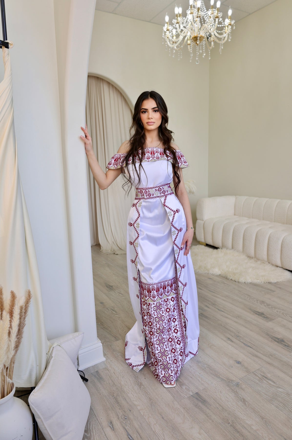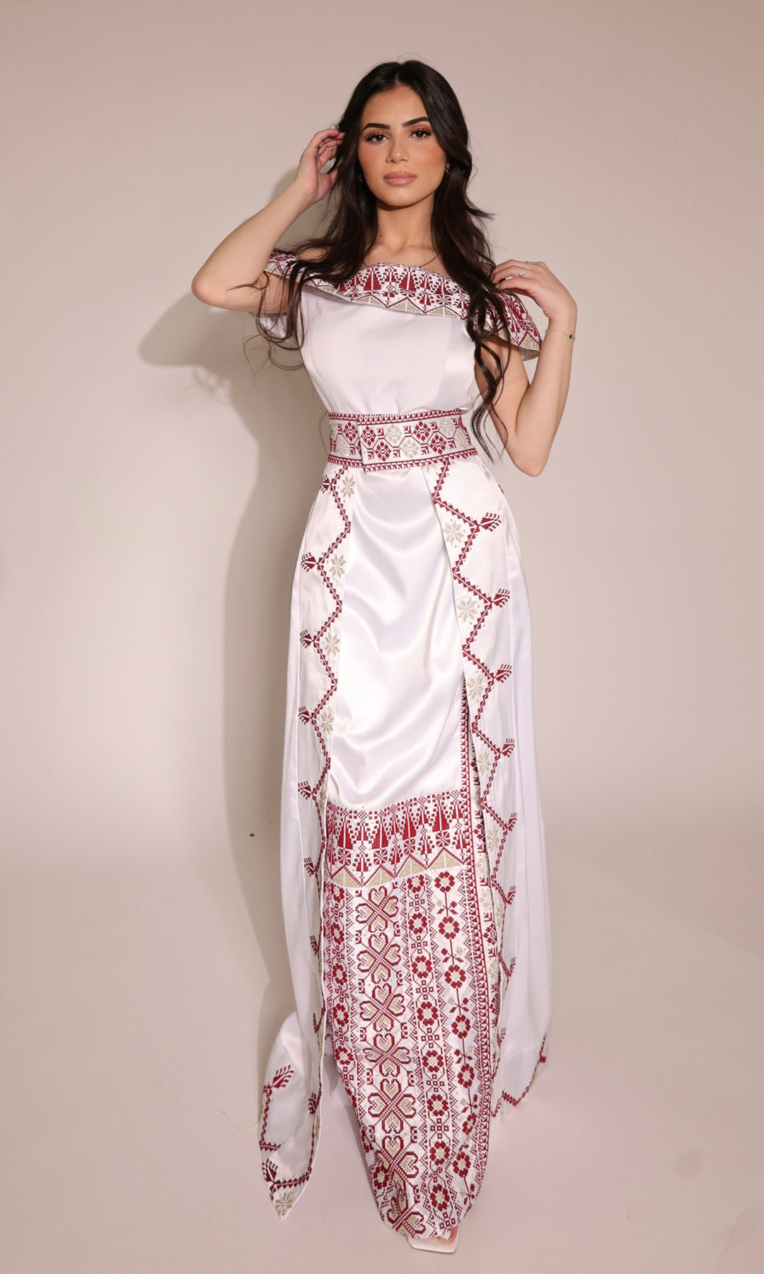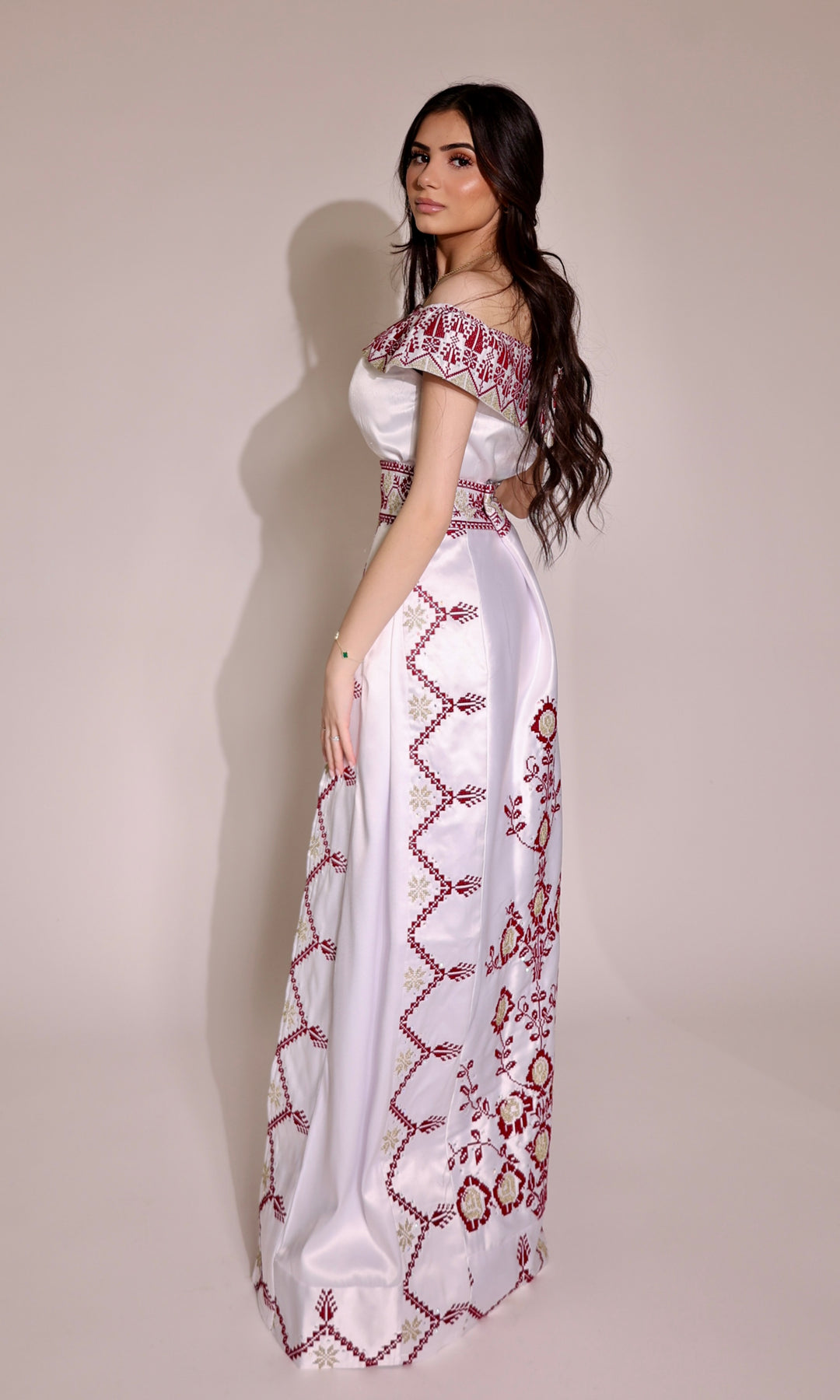 Celebrate heritage with grace in our collection of Traditional Palestinian Dresses, each piece a timeless blend of cultural pride and contemporary style. Hand-embroidered with intricate Tatreez patterns in vibrant red and gold threads, these dresses showcase the rich artistry of Palestinian craftsmanship. Crafted from luxurious satin fabric, the dresses flow effortlessly with a flattering fit and off-shoulder neckline, exuding elegance at every angle.