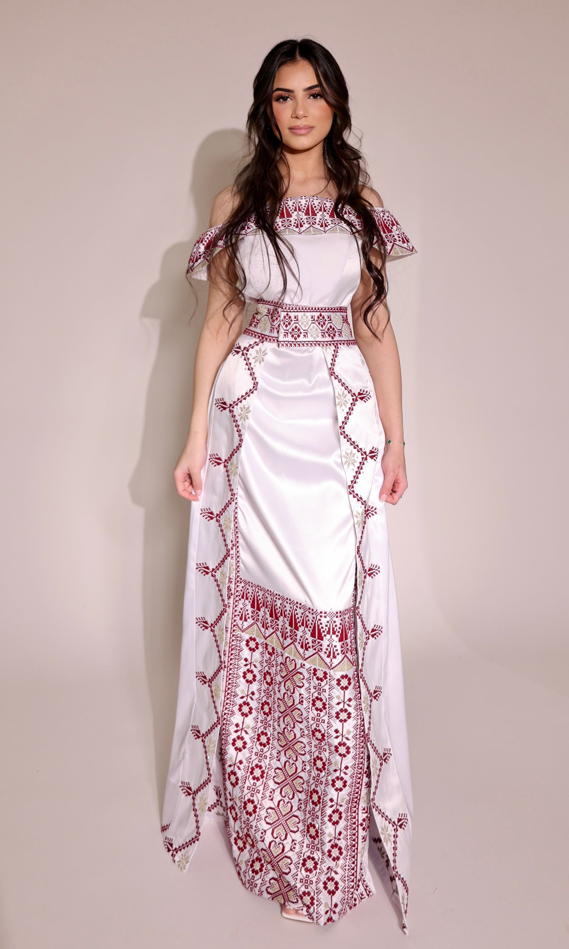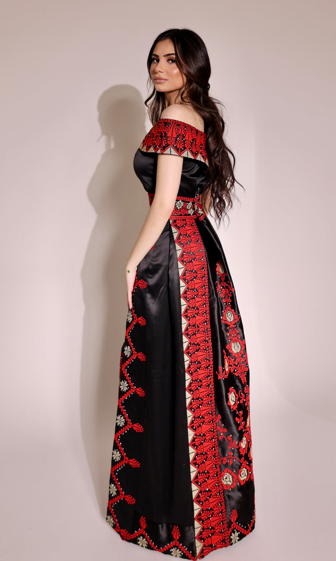 Celebrate heritage with grace in our collection of Traditional Palestinian Dresses, each piece a timeless blend of cultural pride and contemporary style. Hand-embroidered with intricate Tatreez patterns in vibrant red and gold threads, these dresses showcase the rich artistry of Palestinian craftsmanship. Crafted from luxurious satin fabric, the dresses flow effortlessly with a flattering fit and off-shoulder neckline, exuding elegance at every angle.