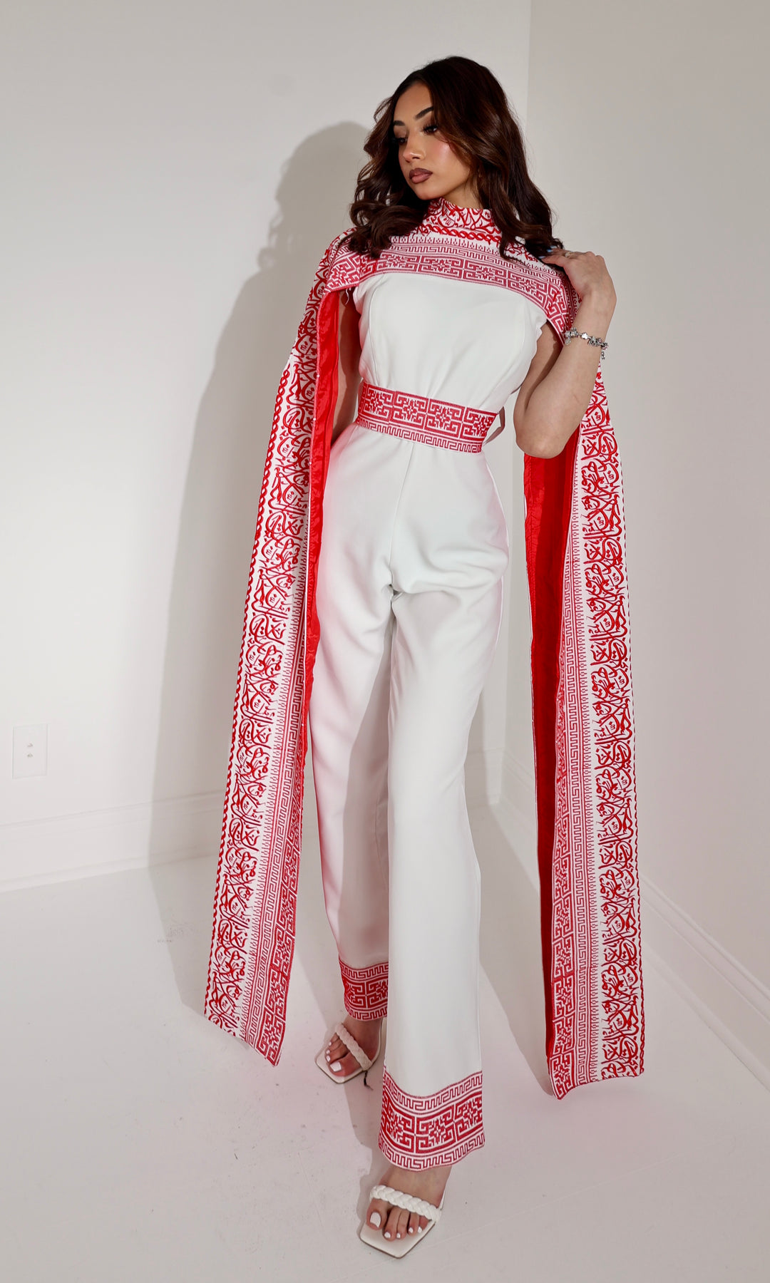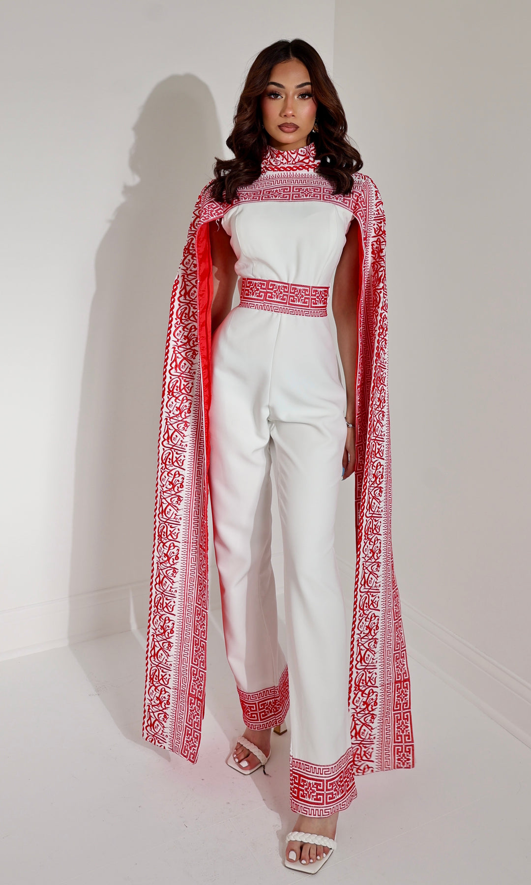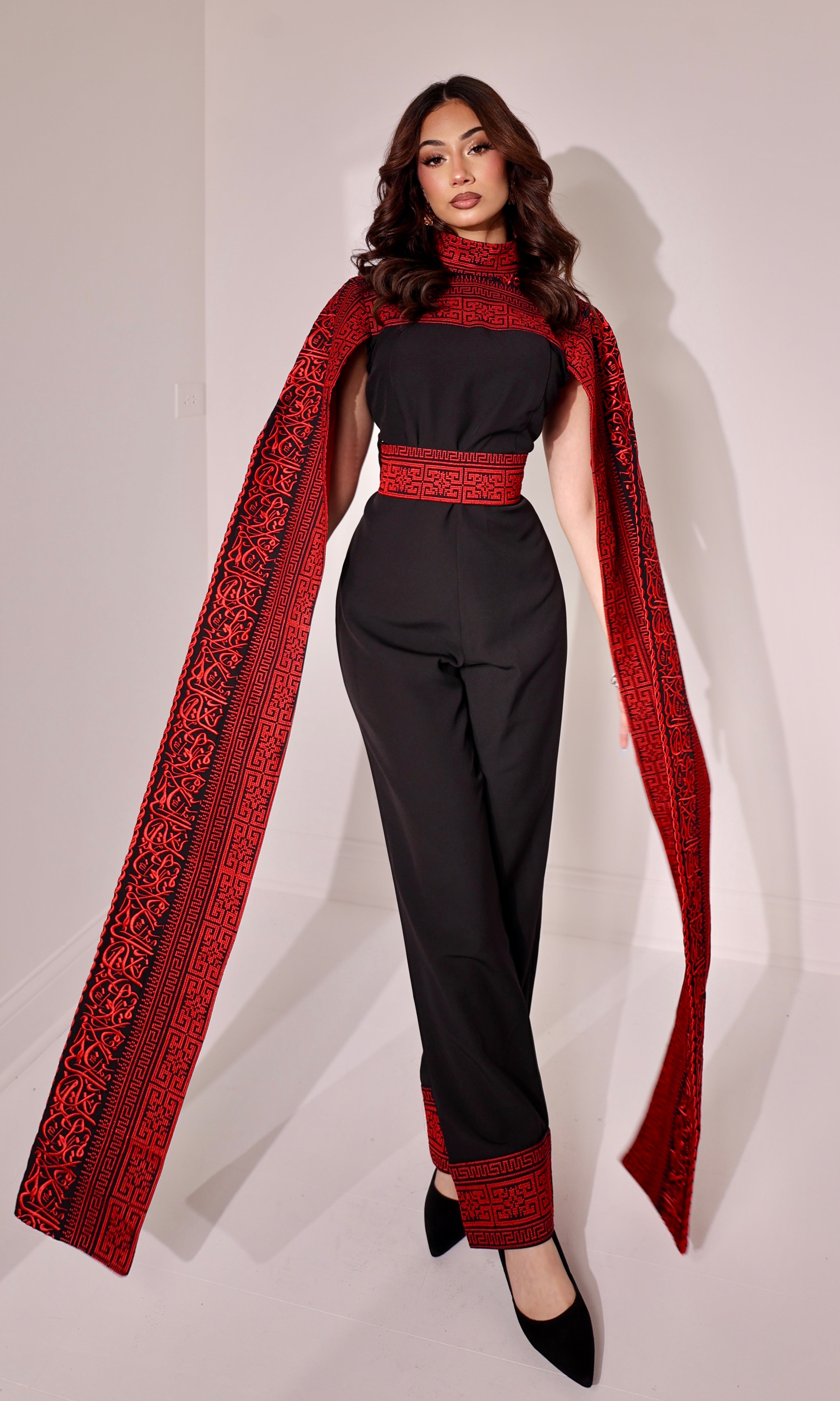 Each piece is meticulously adorned with traditional Palestinian Tatreez embroidery along the neck, waist, cape, and pant hems. The bold embroidery offers a meaningful homage to heritage while making a powerful fashion statement.