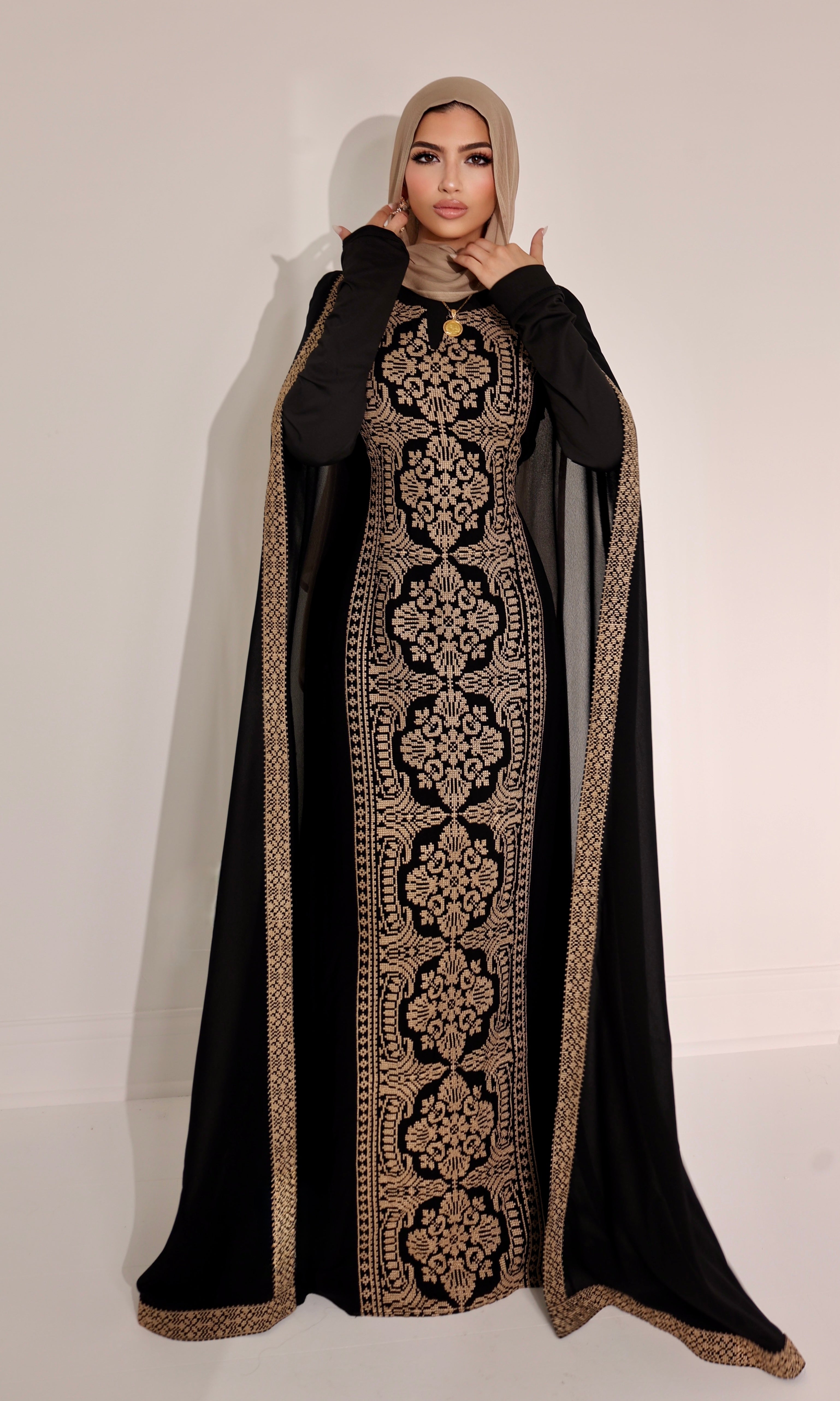 Ramzah Luxury Satin Kaftan Gown with Hand Embellished Sleeves. Elevate your wardrobe with this opulent satin kaftan gown, designed to make a statement at any special occasion. Crafted from high-quality satin fabric, this gown features a flattering A-line silhouette that flows gracefully with every step. The standout design detail is the dramatic cape-style sleeves adorned with intricate silver hand embroidery and beadwork, creating a breathtaking sunburst effect.