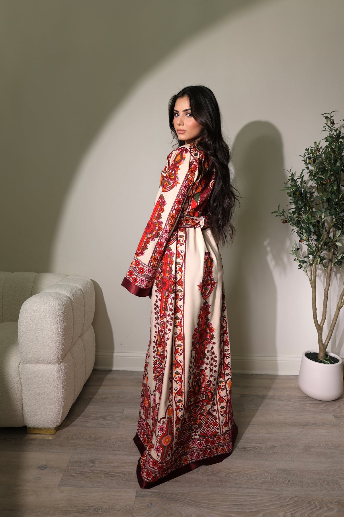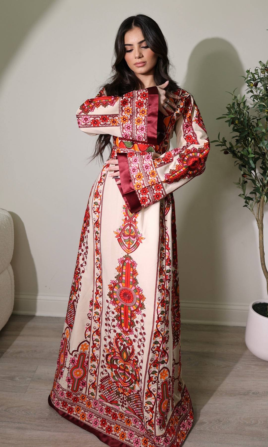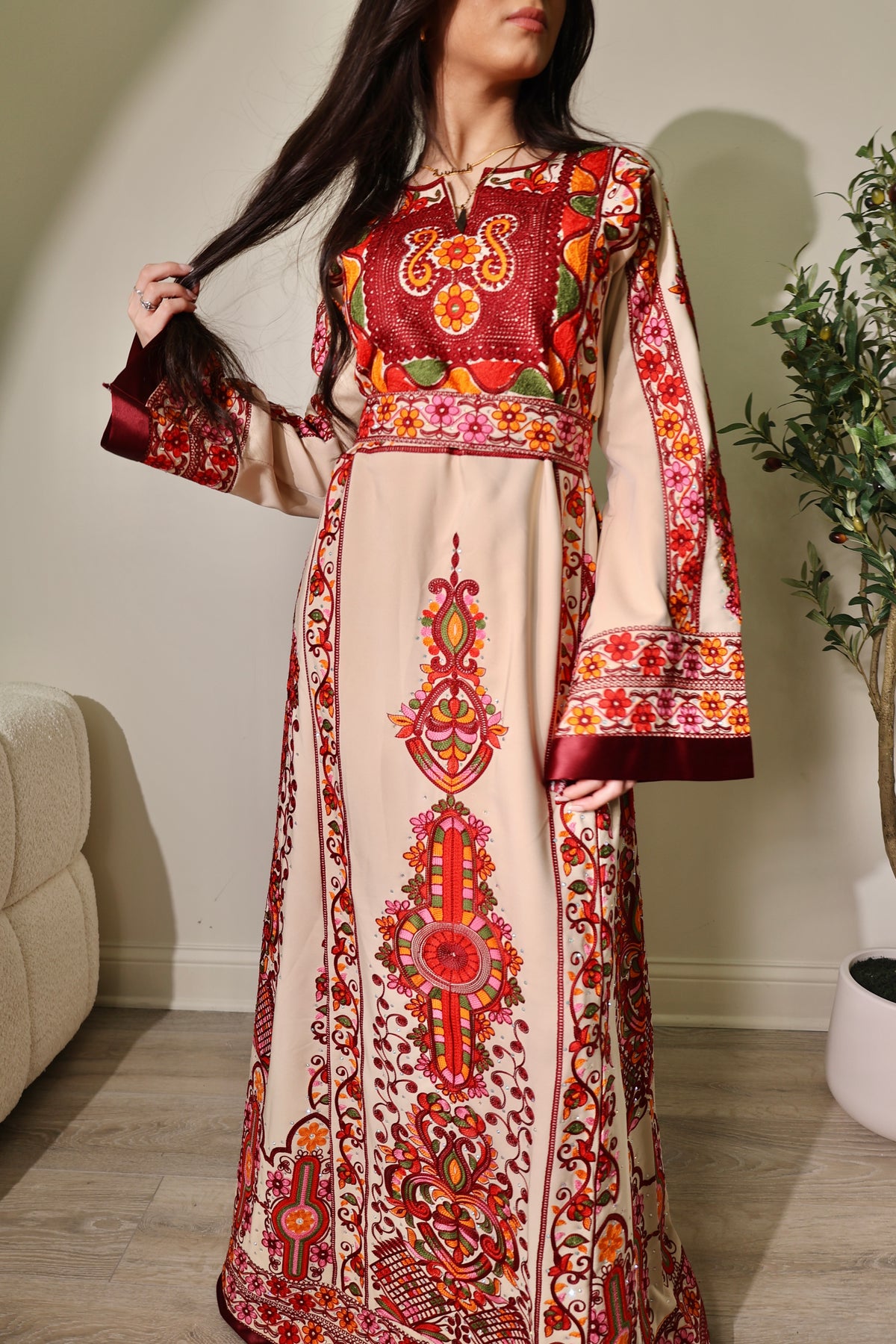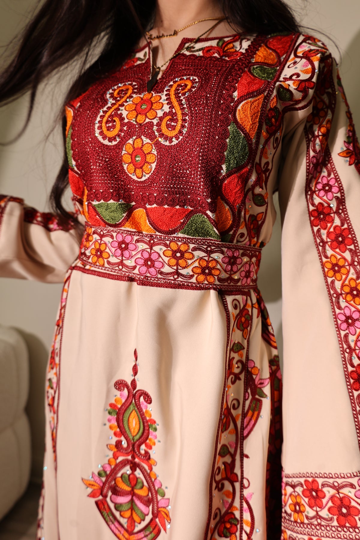 This stunning thobe exemplifies a perfect blend of traditional craftsmanship and modern elegance. Made from high-quality, luxurious fabric, its soft beige ish cream color beautifully highlights the intricate floral embroidery in vibrant red, green, and gold hues. The detailed embroidery cascades down the sleeves and front panel, showcasing the meticulous artistry involved.