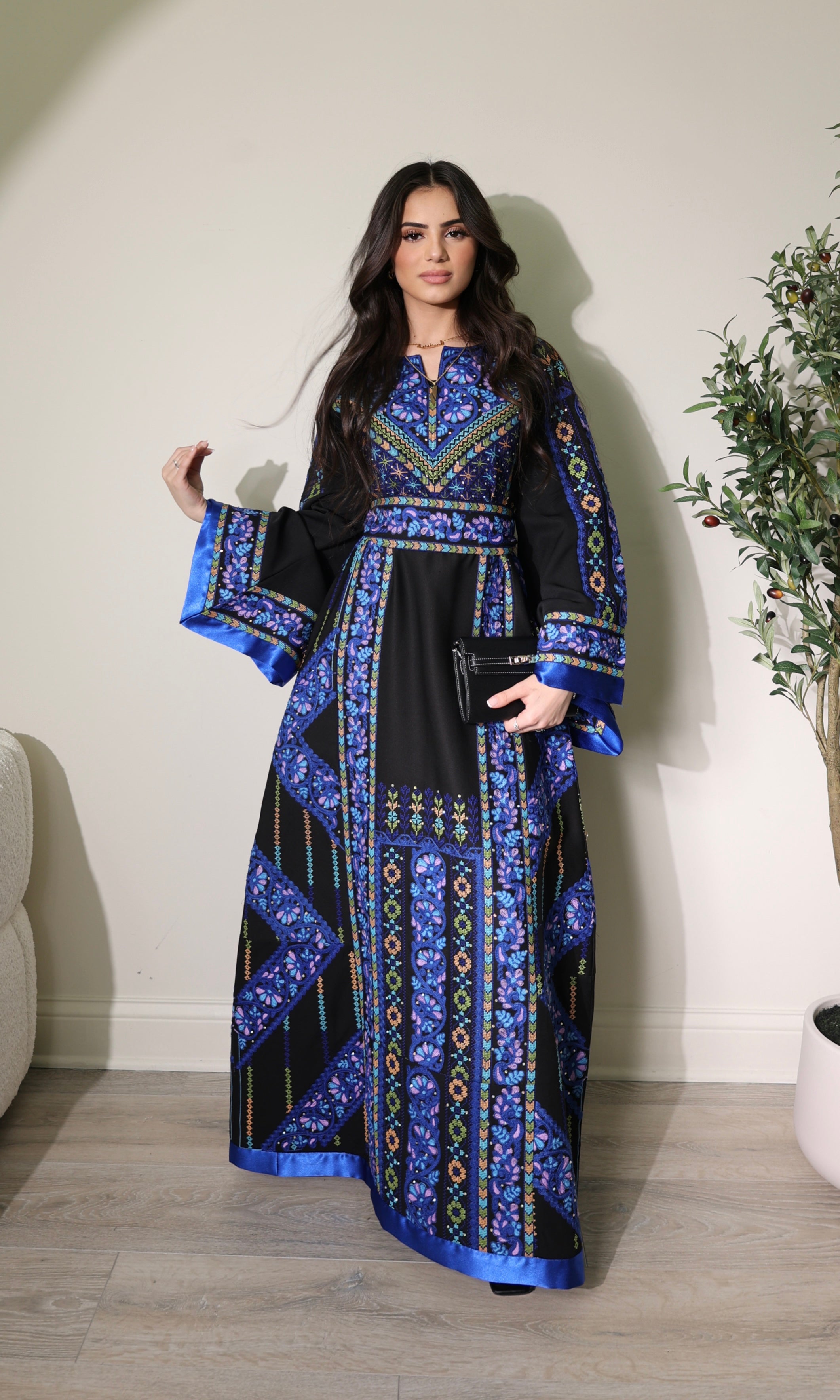 This stunning thobe exemplifies a perfect blend of traditional craftsmanship and modern elegance. Made from high-quality, luxurious fabric, its soft blue color beautifully highlights the intricate floral embroidery in vibrant hues. The detailed embroidery cascades down the sleeves and front panel, showcasing the meticulous artistry involved.
