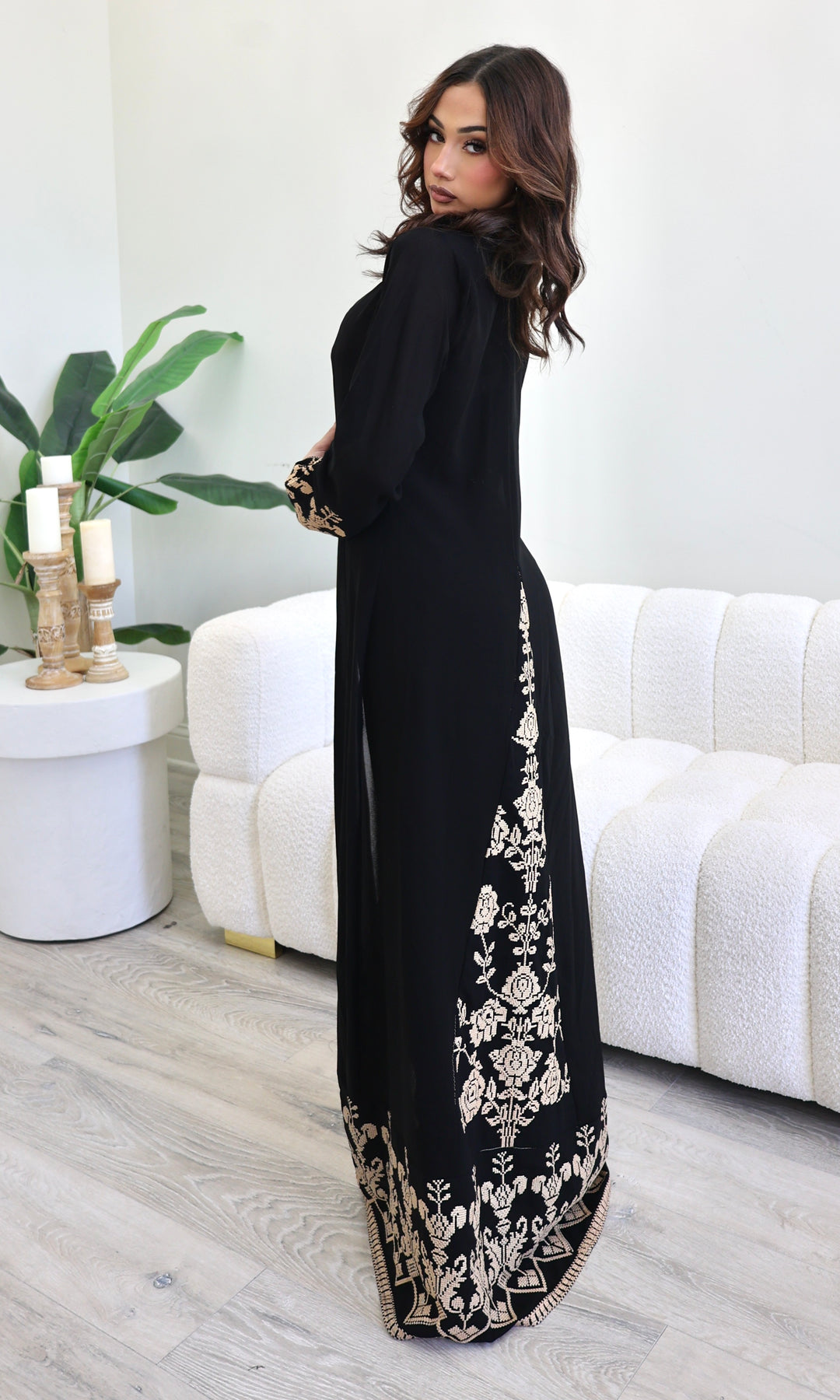 Explore our black captivating Thobe-inspired Abaya Jumpsuit Set, where tradition meets contemporary style. This ensemble marries the classic silhouette of a thobe with the modern flair of a jumpsuit, offering both elegance and functionality. Crafted with luxurious fabric, it features intricate detailing that pays homage to traditional embroidery, enhancing its timeless appeal.