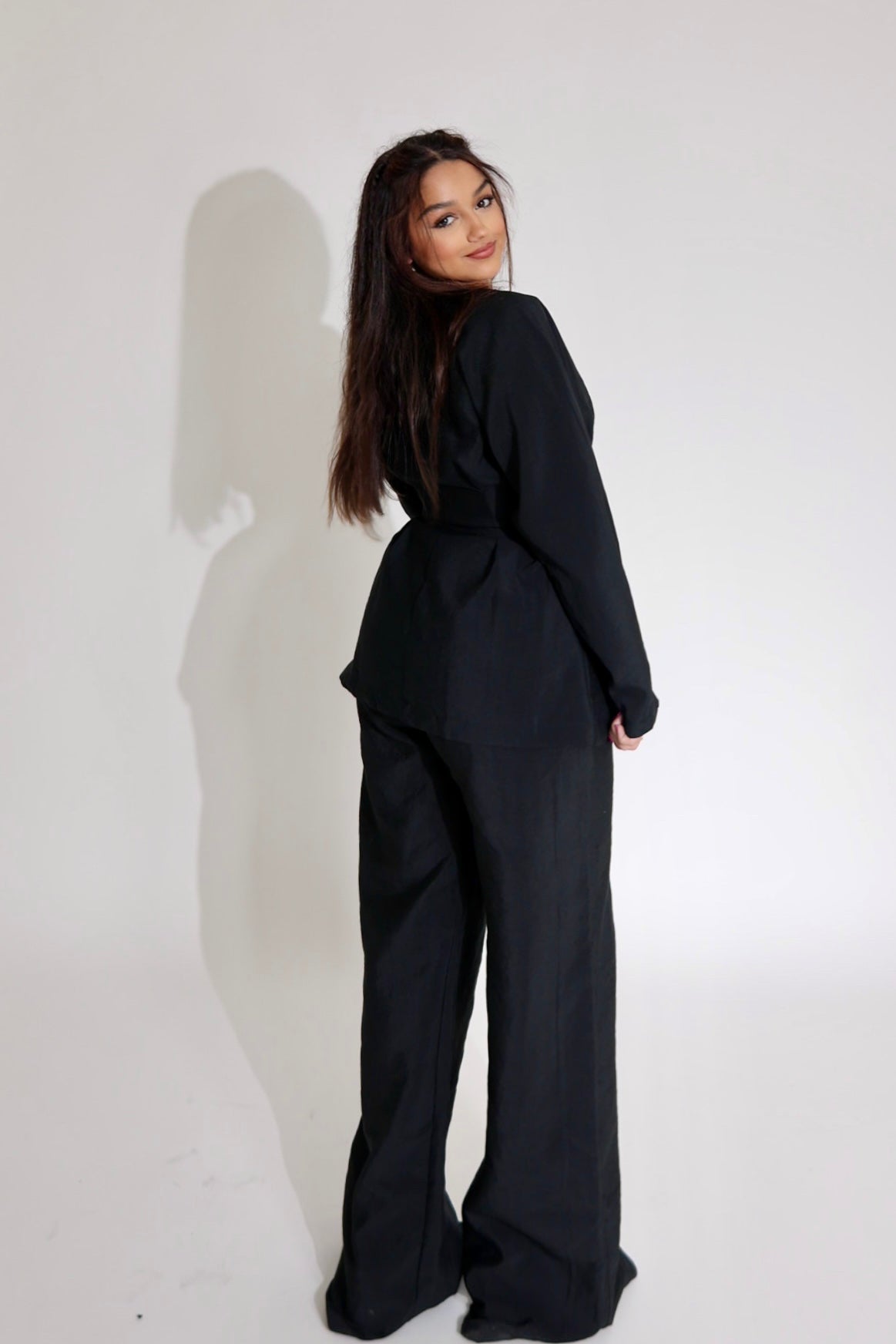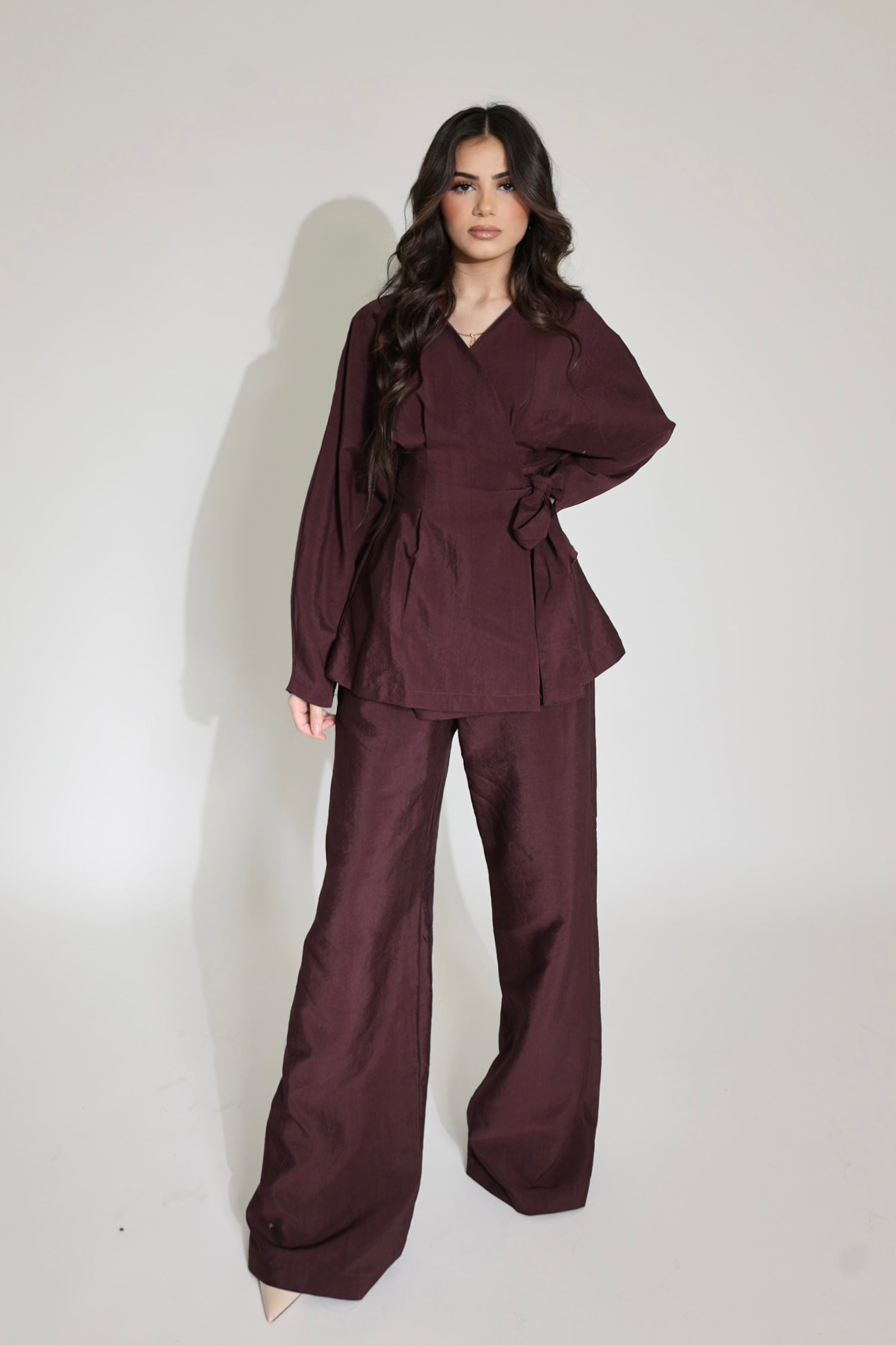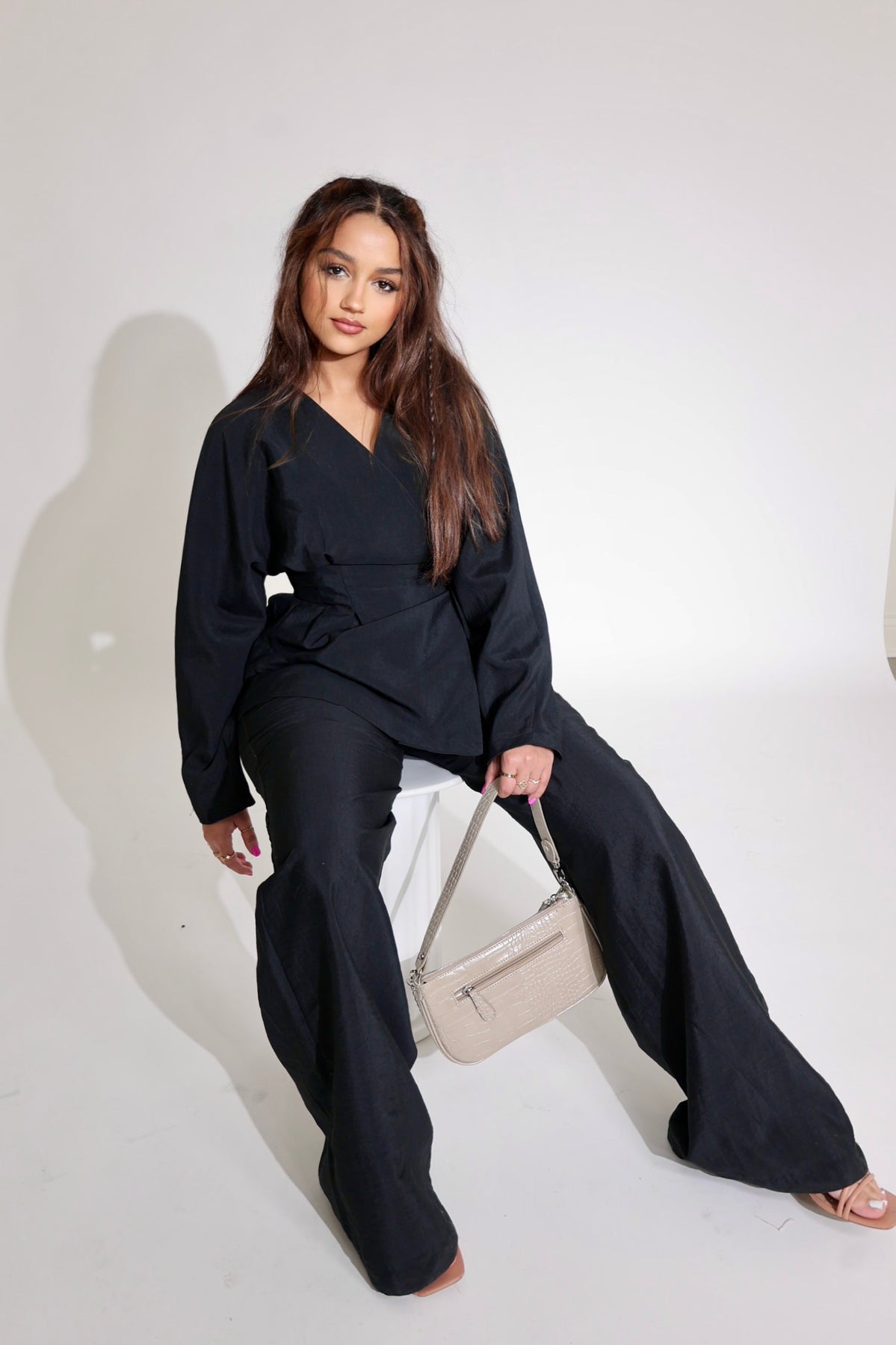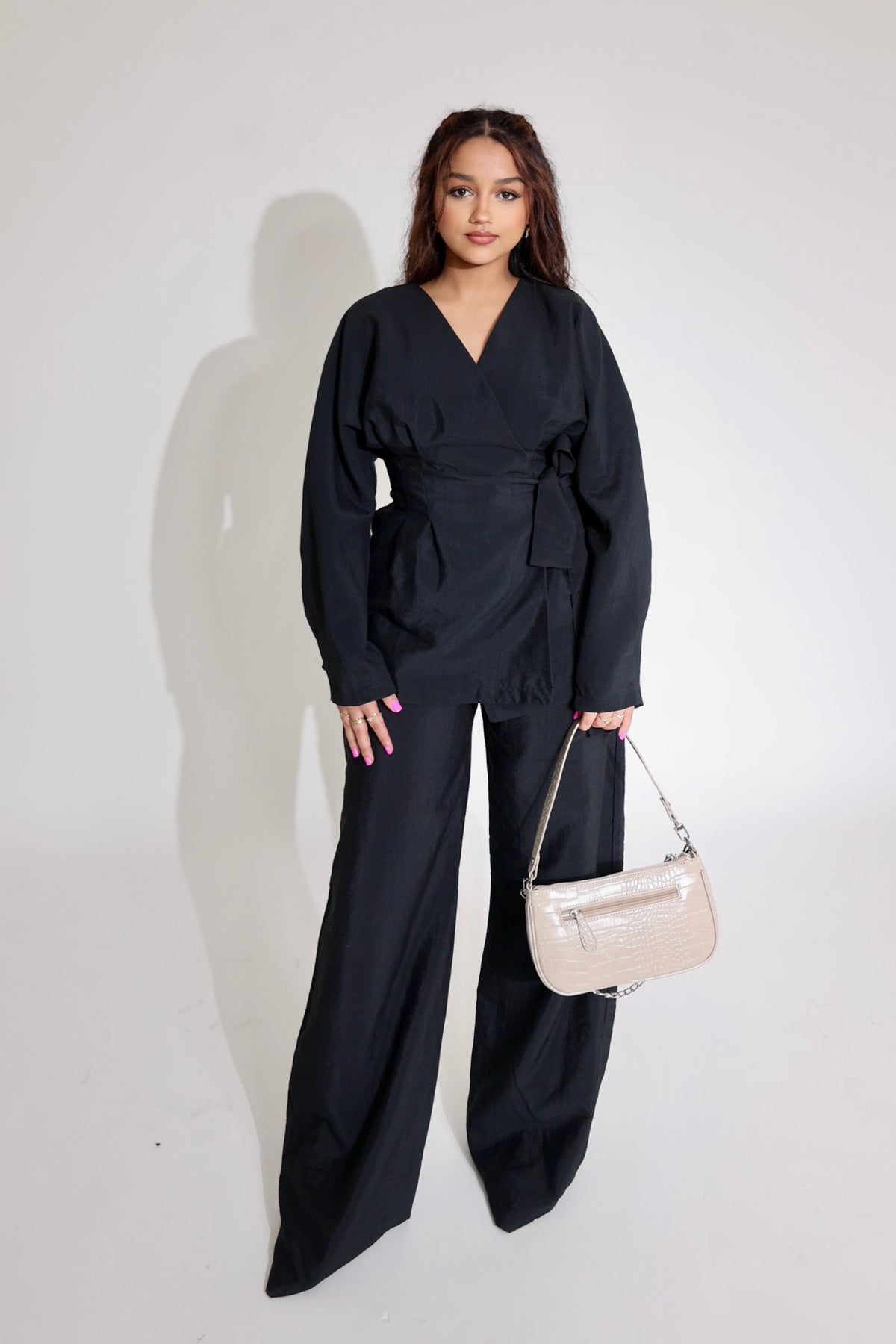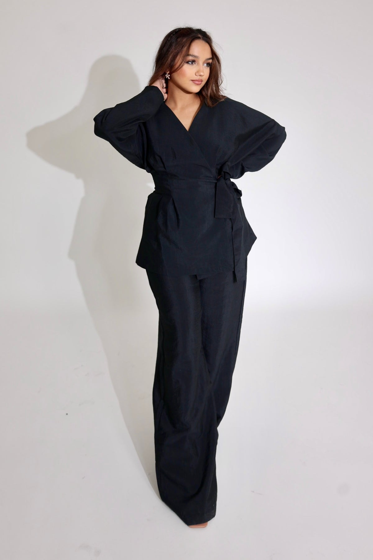 Effortlessly elegant and endlessly versatile, our Linen Wrap Set is designed to elevate your everyday wardrobe. Crafted from breathable, textured linen-blend fabric, this two-piece ensemble features a flattering wrap-style top with adjustable side ties and wide-leg trousers that flow with grace and ease.