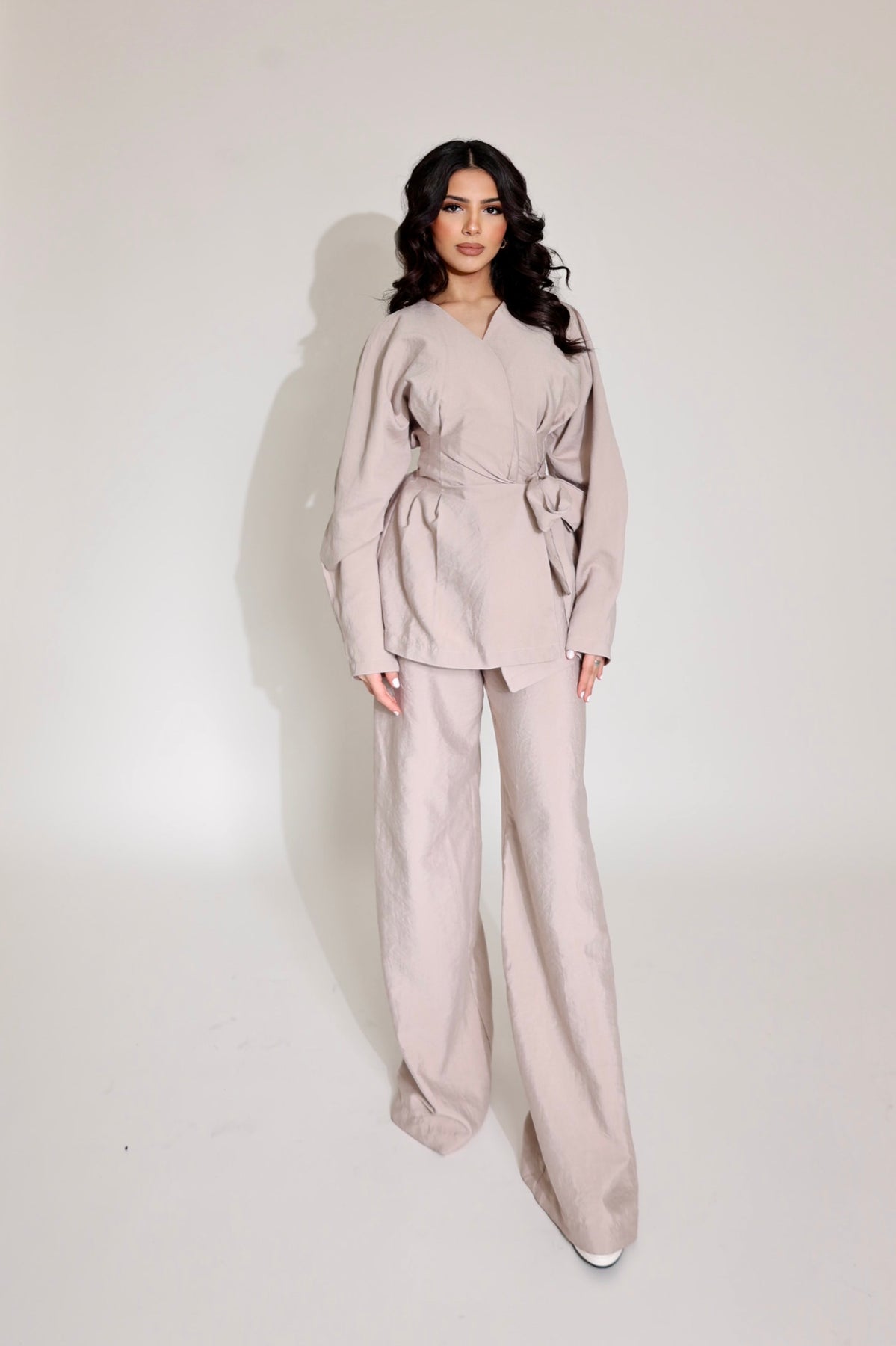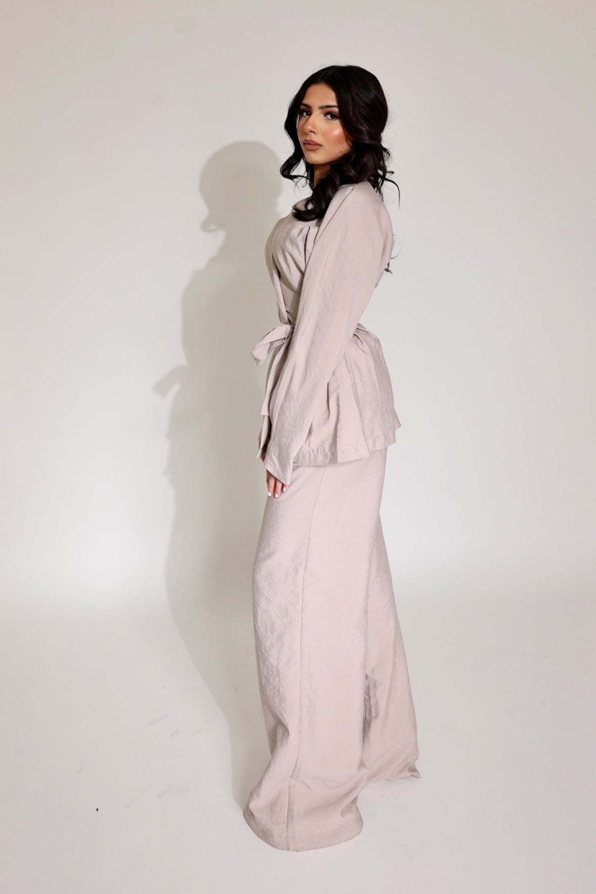 Effortlessly elegant and endlessly versatile, our Linen Wrap Set is designed to elevate your everyday wardrobe. Crafted from breathable, textured linen-blend fabric, this two-piece ensemble features a flattering wrap-style top with adjustable side ties and wide-leg trousers that flow with grace and ease.