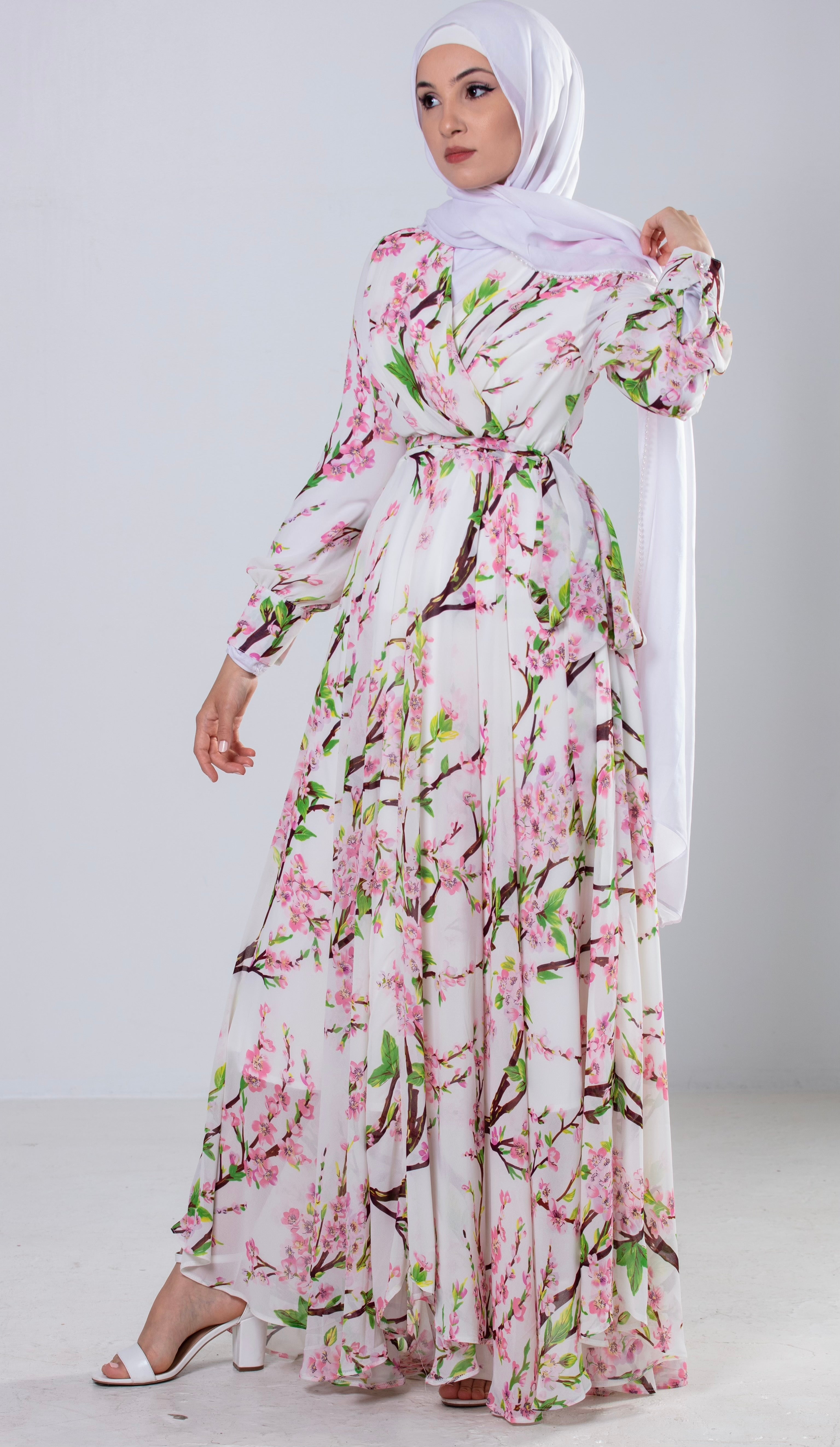 This dress is definitely a show stopper! It is zips from the back and has a little stretch.