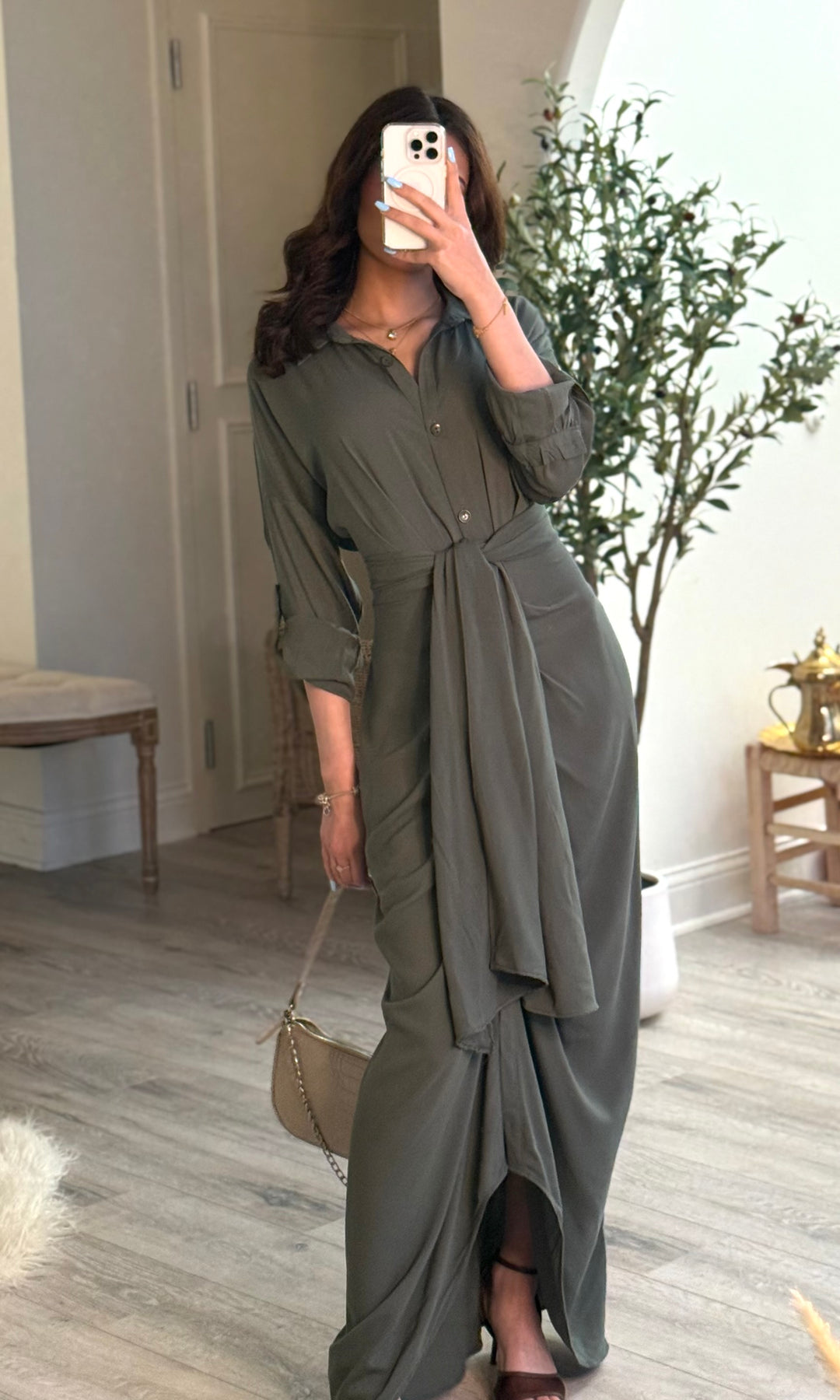Oversized Draped Wrap Maxi ,built-in waist tie, button-down front, and soft pleats that hit every angle. Modest never meant boring. Flowy, cinched, and unapologetically structured. This isn’t your auntie’s modest wear. It’s the Wrap Maxi Dress and it knows what it’s doing.