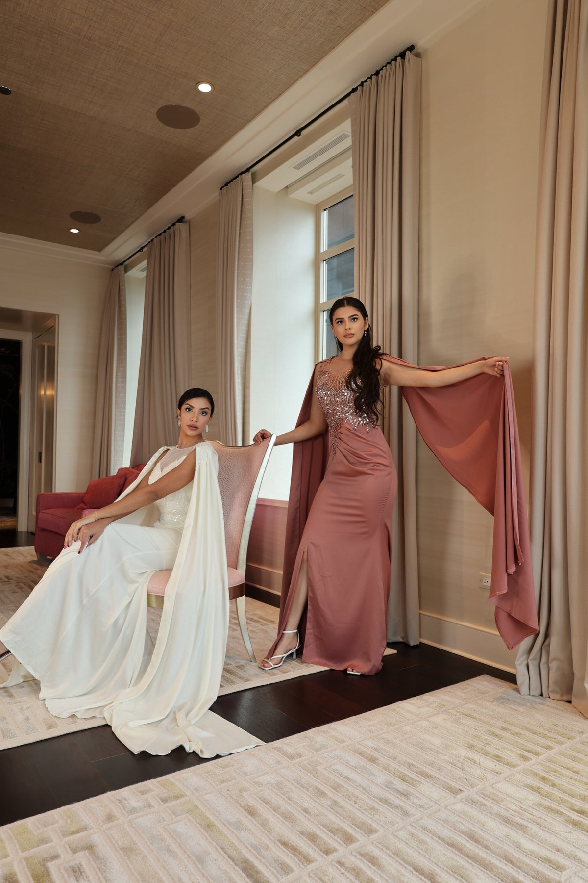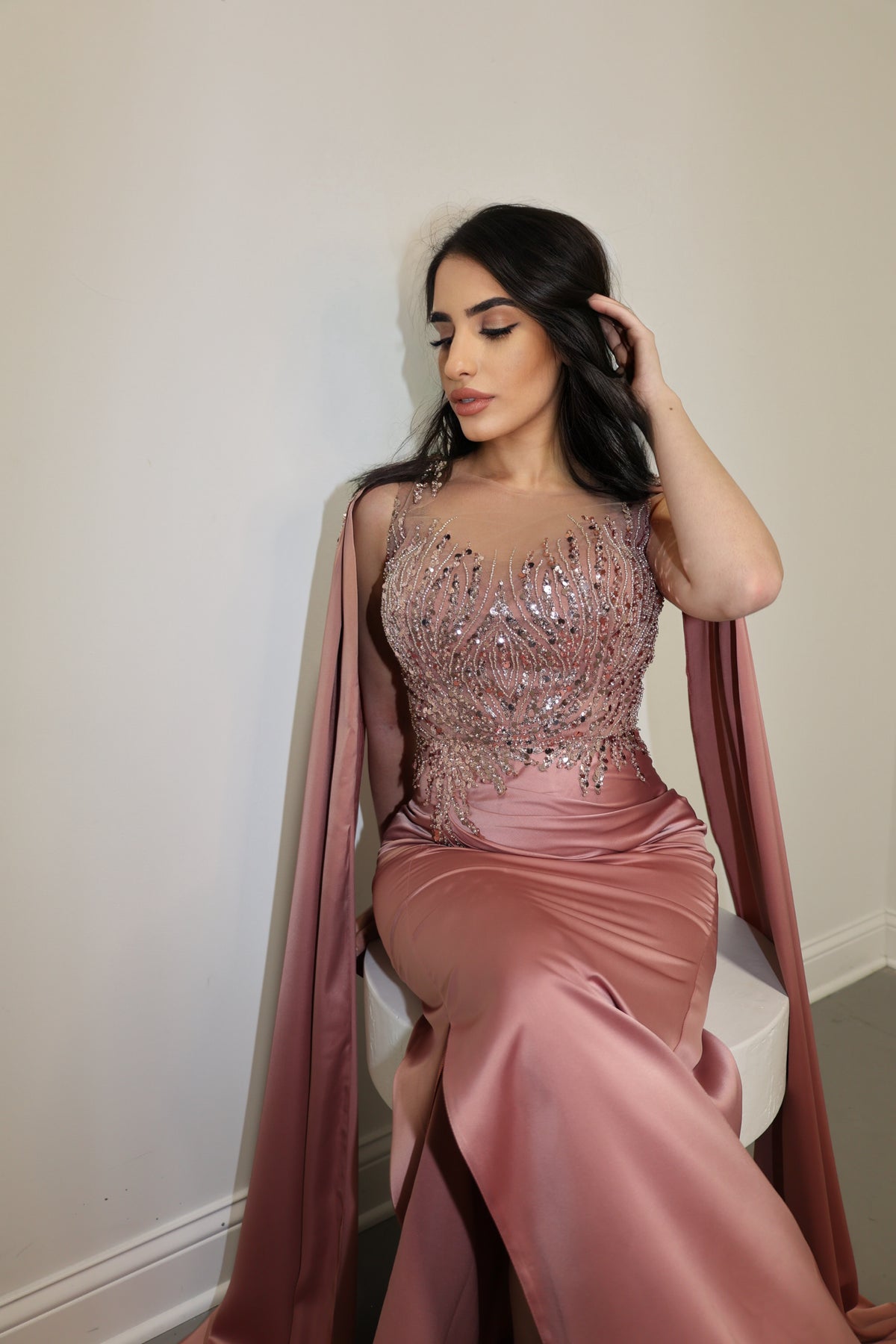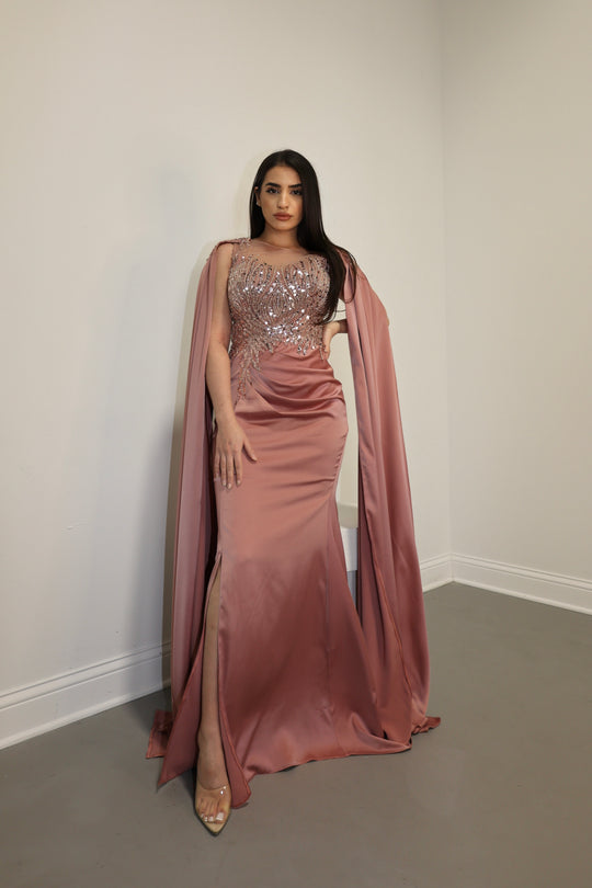 The Hayat dress with beadings on the chest is a luxurious and elegant choice for a formal event. The smooth satin fabric drapes beautifully, creating a polished and sophisticated look. The beadings on the chest add a touch of sparkle and glamour to the dress, drawing attention to the neckline and adding a hint of shimmer to the overall design. The combination of the satin fabric and beadings creates a stunning contrast, elevating the dress to a more formal and glamorous level. This dress is a perfect choice for those looking to make a statement and stand out with a touch of elegance and sophistication.