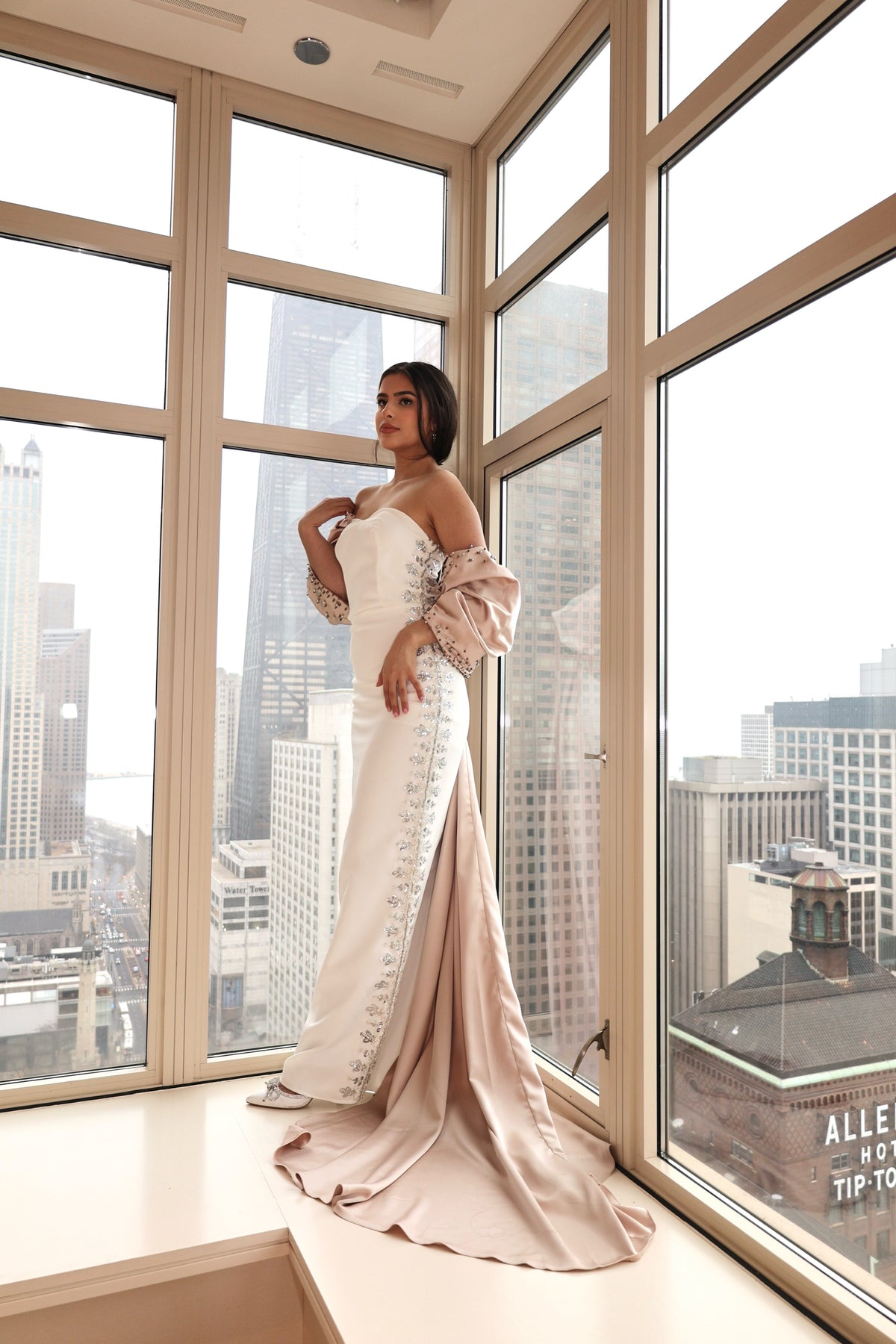 The Maria blossom is a pink strapless dress features a large bow, creating a look that is both elegant and charming. The soft pink color adds a touch of femininity and romance to the dress, perfect for a special occasion. The strapless design showcases the shoulders and collarbones, creating a flattering and sophisticated silhouette. The large bow detail adds a playful and whimsical touch to the dress, making it a standout feature that adds interest and visual appeal. This dress is a perfect choice for those looking to make a statement while maintaining a sense of grace and style.